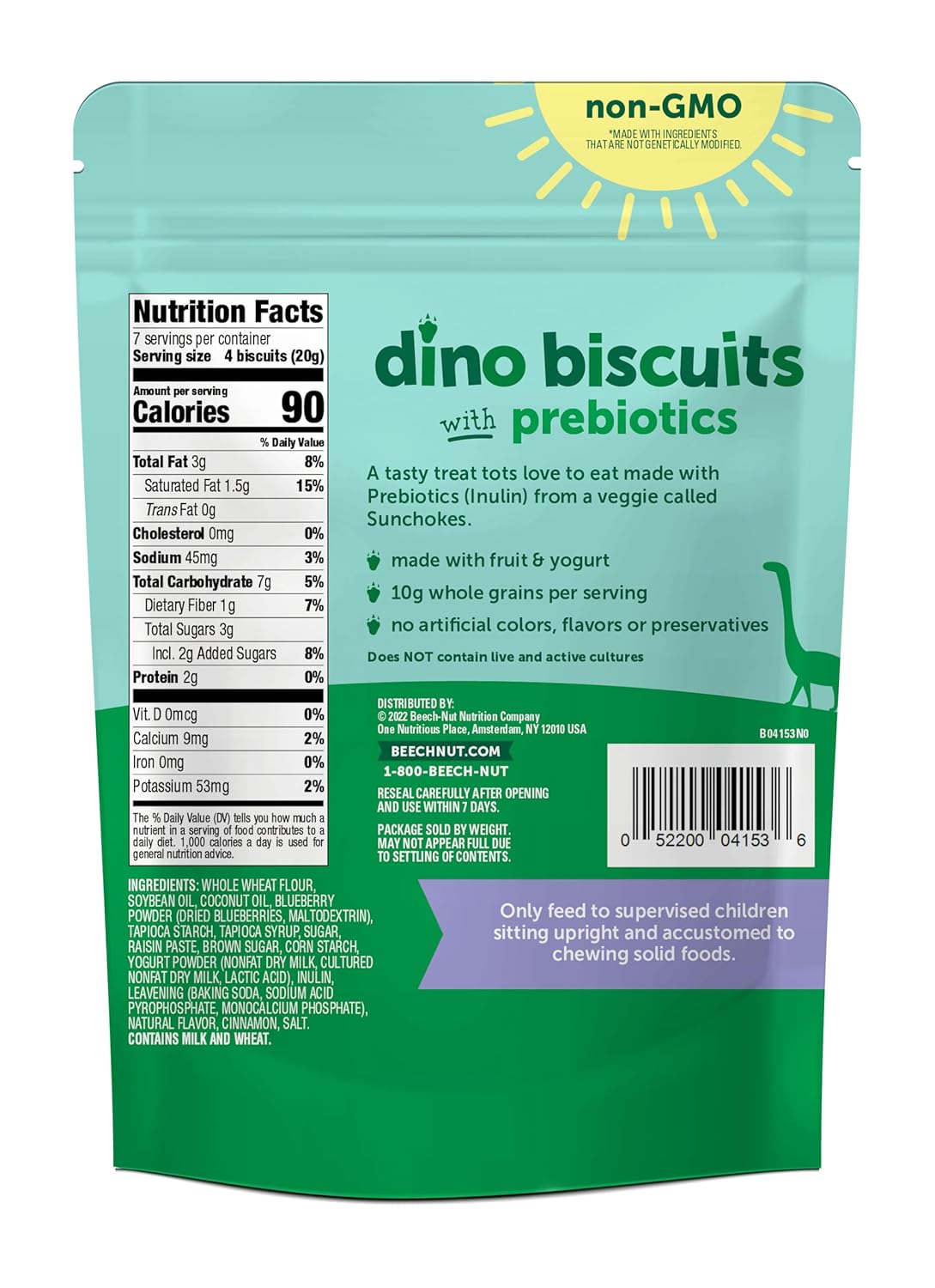 Beech-Nut Dino Biscuits With Prebiotics Are A Delicious, Dinosaur-Themed Snack Loved By Toddlers And Parents Alike. Our Toddler Biscuits Are Made With Blueberries & Yogurt And Feature 10G Of Whole Grains Per Serving And 3G Of Sugar. They'Re Also Made With Prebiotics (Inulin) From A Plant-Based Source, Sunchokes. As A Stage 4 Snack, Dino Biscuits Are Ideal For Children 12+ Months. This Product Should Only Be Fed To Seated, Supervised Children Who Are Accustomed To Chewing Solid Foods