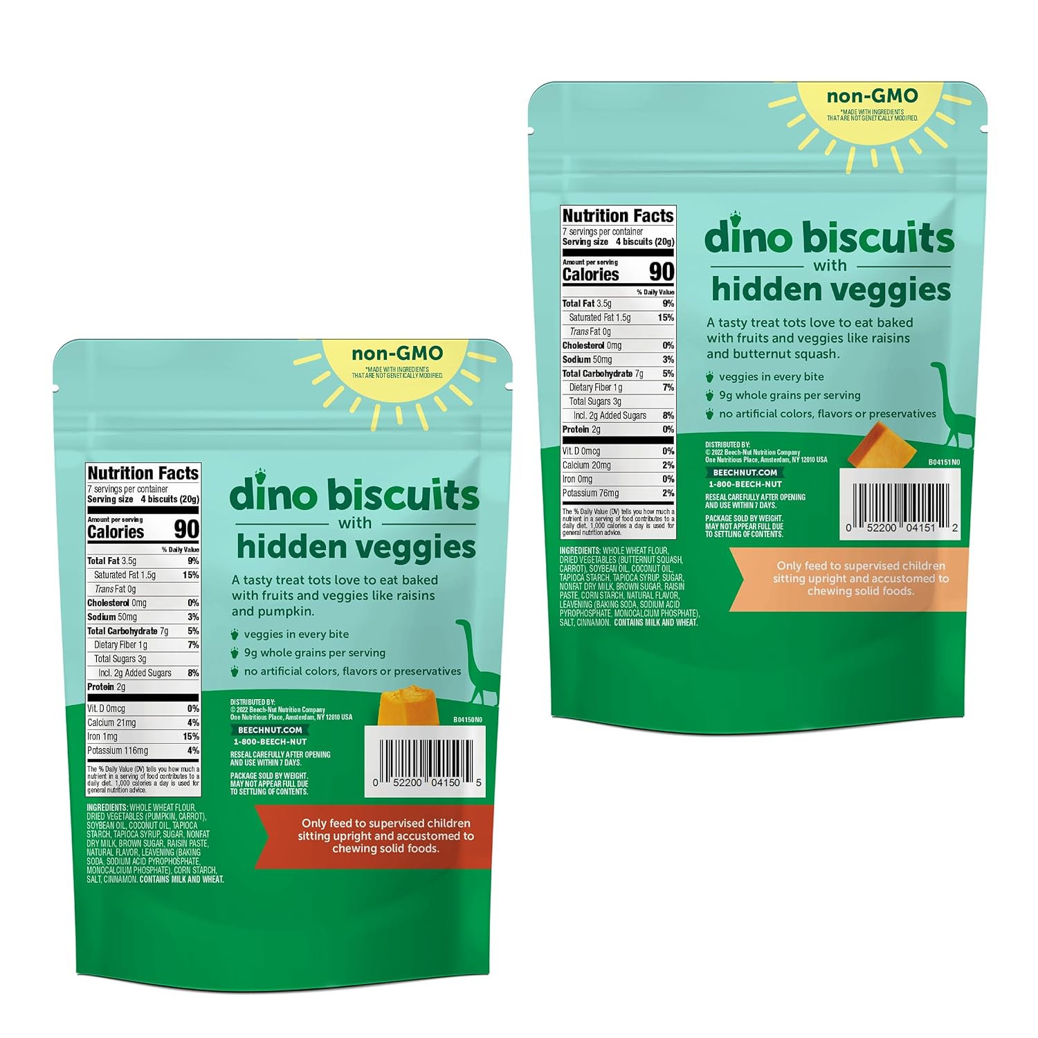 Beech-Nut Dino Biscuits With Hidden Veggies Are A Delicious, Dinosaur-Themed Snack Loved By Toddlers And Parents Alike. This Variety Pack Of Toddler Biscuits Includes 2 Flavors: Pumpkin Cinnamon, Made With Pumpkin, Carrot And Cinnamon And Butternut Bliss, Made With Butternut Squash And Carrot With A Yummy Orange Flavor. This Toddler Snack Features 9G Of Whole Grains Per Serving And 3G Of Sugar--All Packed Into Fun, Dinosaur Shapes. As A Stage 4 Snack, Dino Biscuits Are Ideal For Children 1 Year Old And Up. This Product Should Only Be Fed To Seated, Supervised Children Who Are Accustomed To Chewing Solid Foods
