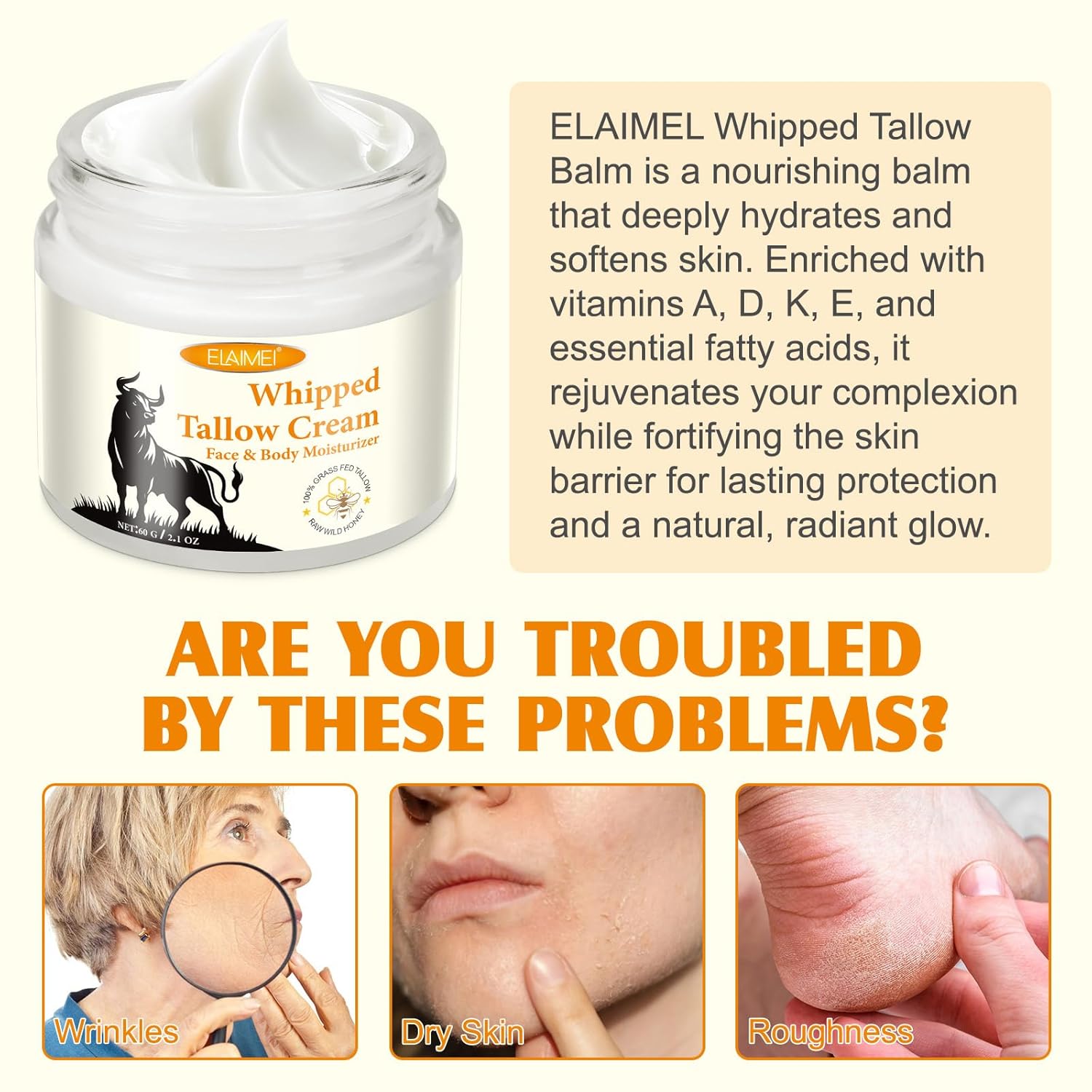 MULTI-USE WHIPPED TALLOW BALM FOR FACE & BODY : This versatile whipped tallow balm works as both a face moisturizer and body lotion, providing deep hydration and skin repair for all areas of the body