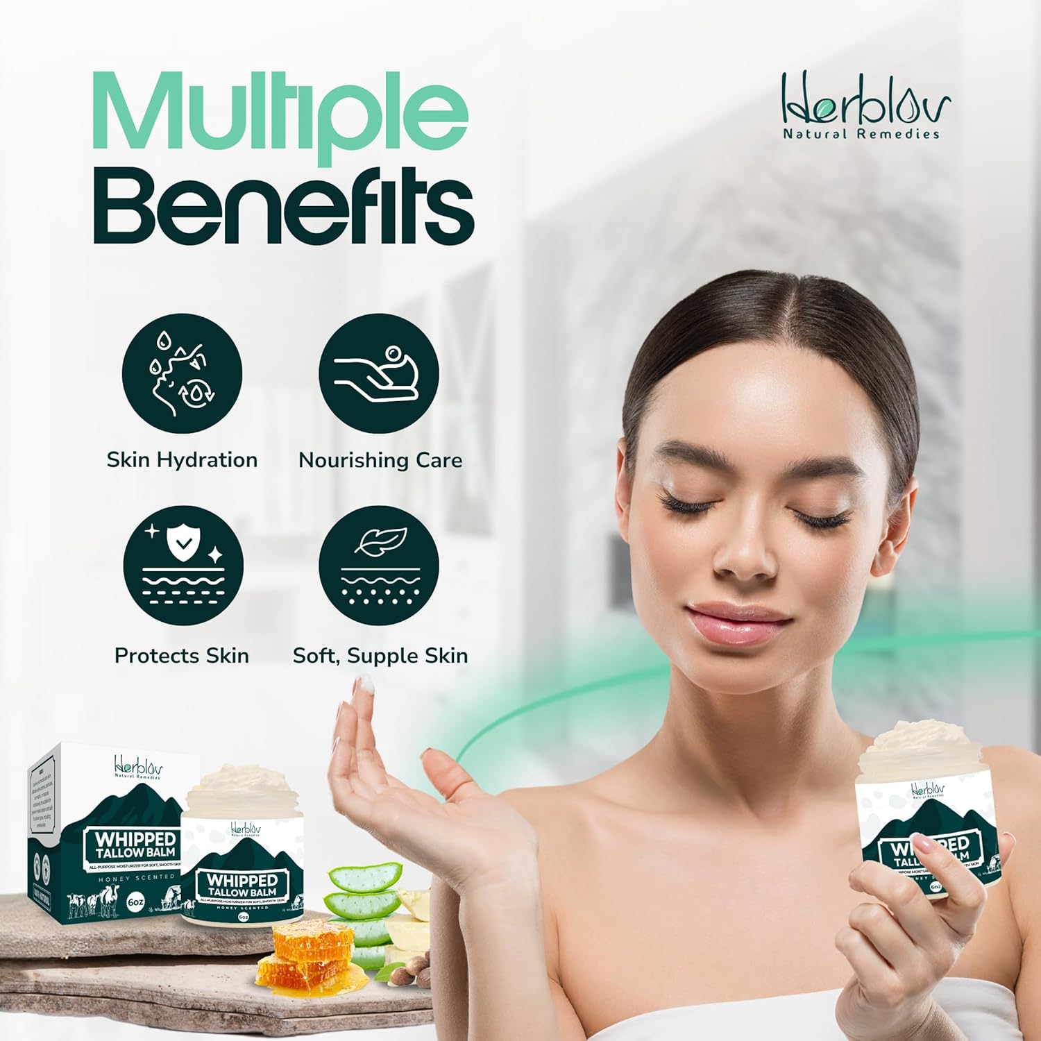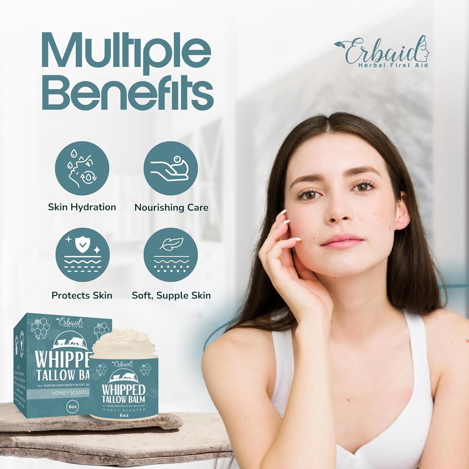 Beef Tallow Balm – Natural Grass Fed Whipped Tallow And Honey All Purpose Balm – Moisturizing Face And Body Lotion For Eczema, Cracked, Dry, Itchy, Irritated Skin – Skin Repair Skincare Made In Usa