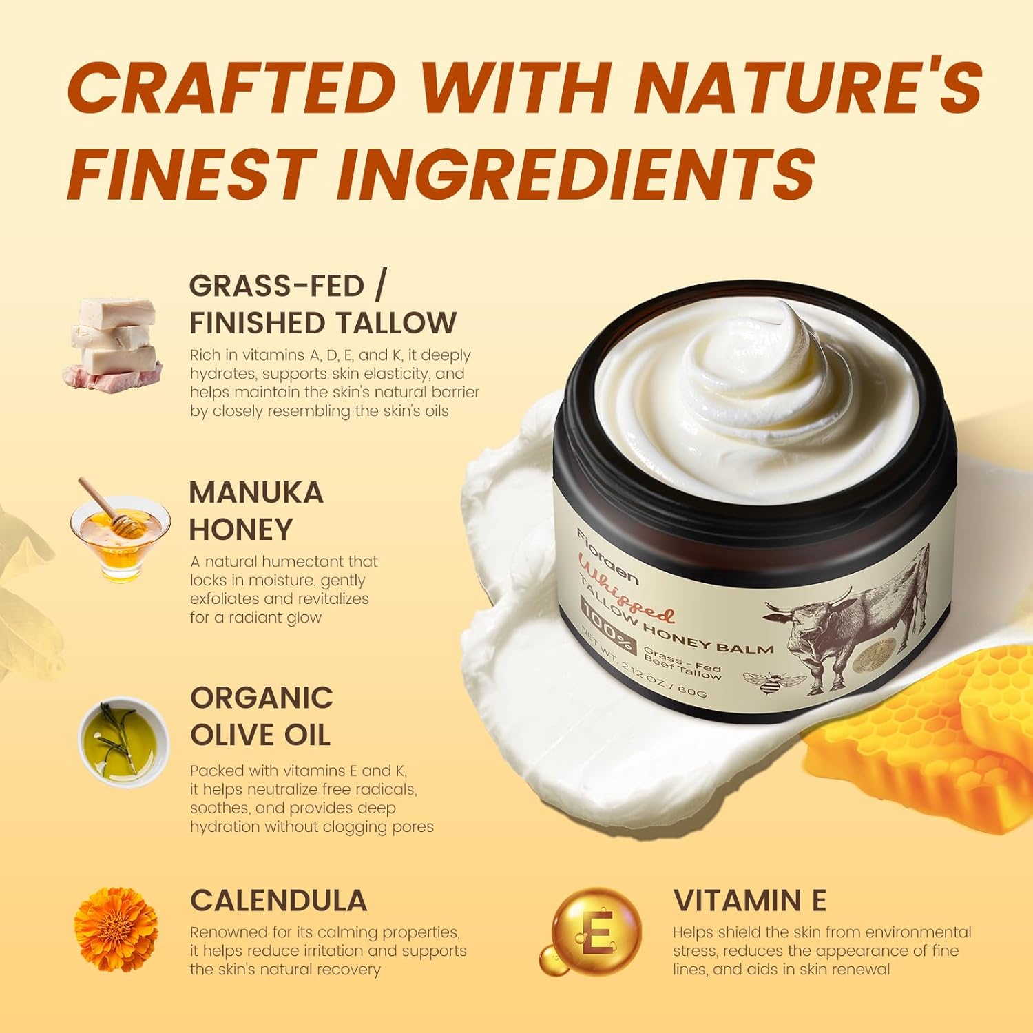 Deeply Nourishing and Hydrating: Enriched with vitamins A, D, K, E, and essential fatty acids, our whipped tallow honey balm provides intense hydration and nourishment. It's non-greasy formula absorbs quickly, leaving your skin feeling smooth, supple, and revitalized