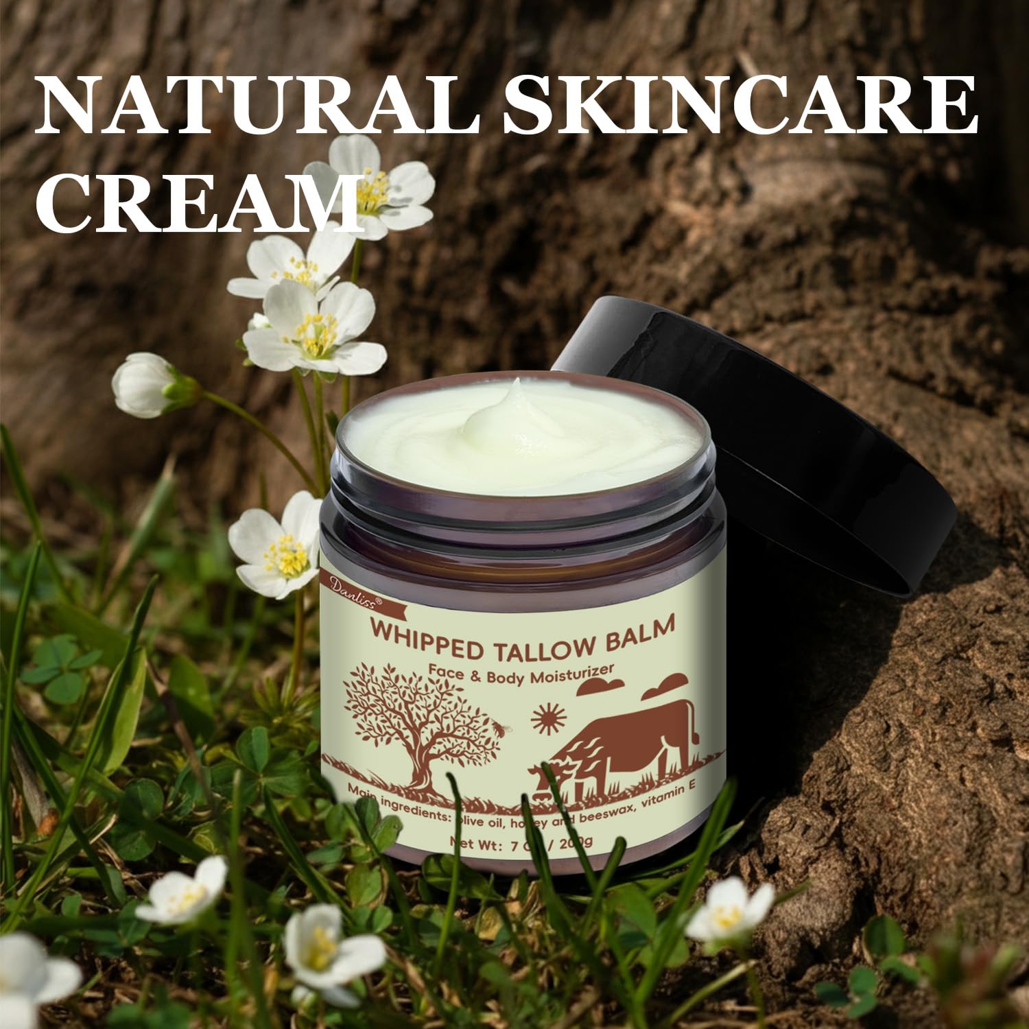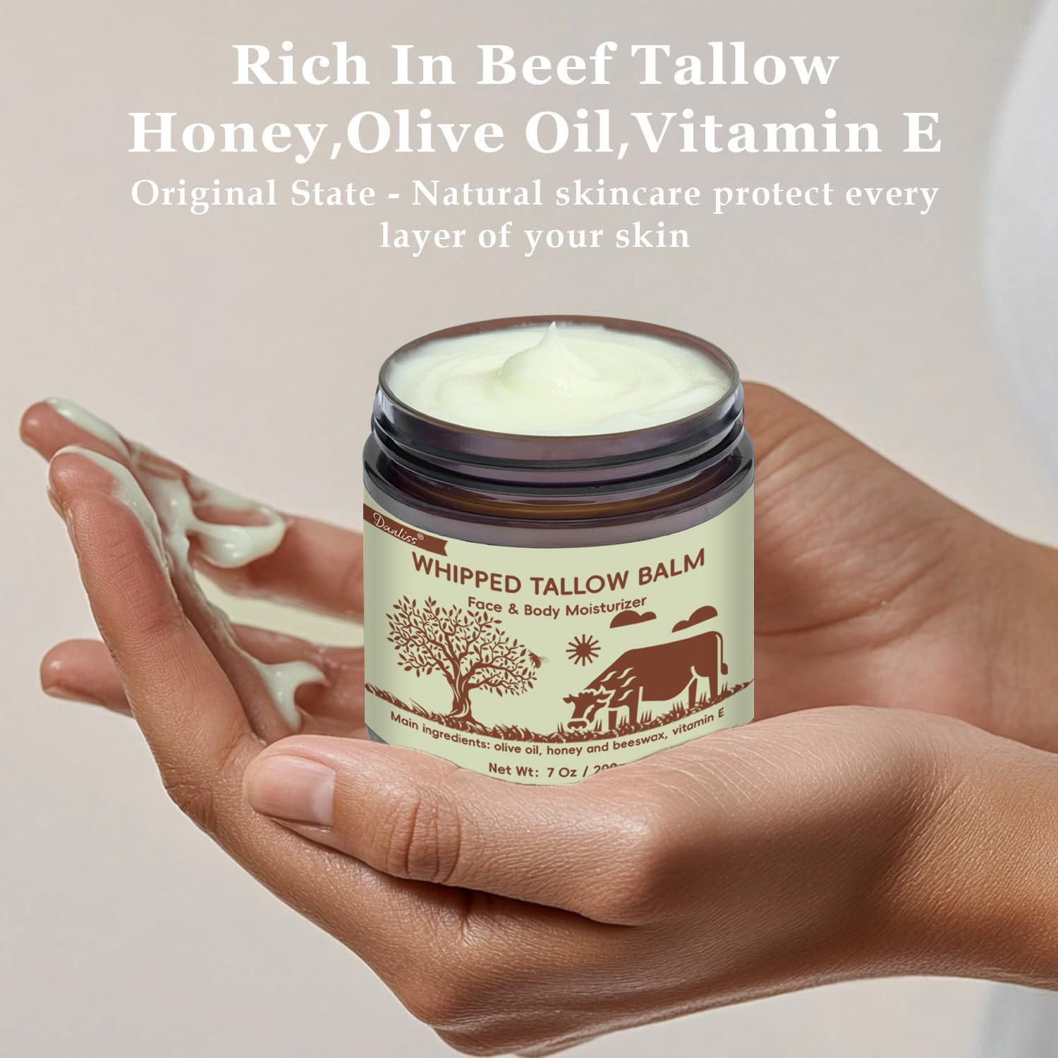 About this item Our beef tallow is sourced from small farmers practicing regenerative agriculture, where cows are rotationally grazed year-round and only fed grass, with no additional feed. This natural, ethical farming method ensures the cows are healthy and happy, producing a beautiful golden tallow rich in vitamins and minerals. Our tallow is blended with natural ingredients like avocado and honey, which are packed with antioxidants. This makes our tallow an excellent moisturizer that hydrates the skin, reduces fine lines, and won’t clog pores. It’s gentle yet highly effective, suitable for all skin types, especially sensitive skin. The tallow balm has a mild, natural fragrance with just a subtle butter scent—there's no beefy or unpleasant odor, offering a clean and pure skincare experience. With a light, satisfying texture, the combination of tallow and honey creates a balm that applies smoothly like a traditional cream, free of harmful chemicals such as phthalates or parabens. This tallow balm is especially perfect for dry or sensitive skin. It is fragrance-free, ensuring even the most delicate skin can enjoy its nourishing and soothing benefits › See more product details,Our beef tallow is sourced from small farmers practicing regenerative agriculture, where cows are rotationally grazed year-round and only fed grass, with no additional feed. This natural, ethical farming method ensures the cows are healthy and happy, producing a beautiful golden tallow rich in vitamins and minerals,Our tallow is blended with natural ingredients like avocado and honey, which are packed with antioxidants. This makes our tallow an excellent moisturizer that hydrates the skin, reduces fine lines, and won’t clog pores. It’s gentle yet highly effective, suitable for all skin types, especially sensitive skin,The tallow balm has a mild, natural fragrance with just a subtle butter scent—there's no beefy or unpleasant odor, offering a clean and pure skincare experience,With a light, satisfying texture, the combination of tallow and honey creates a balm that applies smoothly like a traditional cream, free of harmful chemicals such as phthalates or parabens,This tallow balm is especially perfect for dry or sensitive skin. It is fragrance-free, ensuring even the most delicate skin can enjoy its nourishing and soothing benefits