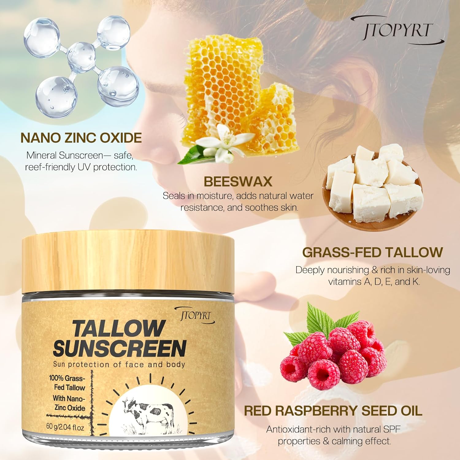 Beef Tallow Sunscreen: Tallow With Zinc Oxide & Beeswax - Natural Moisturizing Protection For Dry Sensitive Skin & All Ages, Non-Greasy Formula 60G