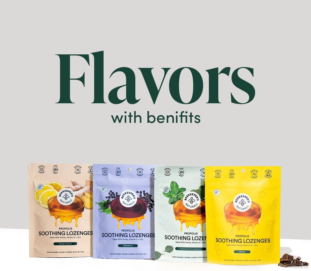 About this item NATURAL COUGH DROPS: Not your average cough drops, these propolis lozenges are made with powerful ingredients: Raw honey, propolis, eucalyptus, peppermint, Vitamin D and zinc, that promote immune health while soothing dry, scratchy throats. (And they taste great, too.) CLEAN & NATURAL INGREDIENTS: Our honey lozenges only contain 1 gram of sugar and have absolutely no refined sugars! Formulated with nature-sourced ingredients, these cough drops do not contain any unnecessary additives like maltodextrin, glucose syrup, soy lecithin, or artificial dyes and flavors. IMMUNE SUPPORT LOZENGES: Clean, effective remedies that are backed by science. Made with highly concentrated bee propolis, zinc and Vitamin D to support your immune system on the go. Product packaging may vary as we refreshed our packaging and are currently transitioning between old and new packaging. Our ingredients & formula that you know and love remain the same! INGREDIENTS: Honey, Propolis, Peppermint, Eucalyptus, Vitamin D, Zinc, Chicory Root Fiber, Tapioca Syrup, Monk Fruit. CAUTION: People allergic to bees, honey or bee products may experience allergic reactions. โบ See more product details,NATURAL COUGH DROPS: Not your average cough drops, these propolis lozenges are made with powerful ingredients: Raw honey, propolis, eucalyptus, peppermint, Vitamin D and zinc, that promote immune health while soothing dry, scratchy throats. (And they taste great, too.),CLEAN & NATURAL INGREDIENTS: Our honey lozenges only contain 1 gram of sugar and have absolutely no refined sugars! Formulated with nature-sourced ingredients, these cough drops do not contain any unnecessary additives like maltodextrin, glucose syrup, soy lecithin, or artificial dyes and flavors,IMMUNE SUPPORT LOZENGES: Clean, effective remedies that are backed by science. Made with highly concentrated bee propolis, zinc and Vitamin D to support your immune system on the go,Product packaging may vary as we refreshed our packaging and are currently transitioning between old and new packaging. Our ingredients & formula that you know and love remain the same!,INGREDIENTS: Honey, Propolis, Peppermint, Eucalyptus, Vitamin D, Zinc, Chicory Root Fiber, Tapioca Syrup, Monk Fruit. CAUTION: People allergic to bees, honey or bee products may experience allergic reactions