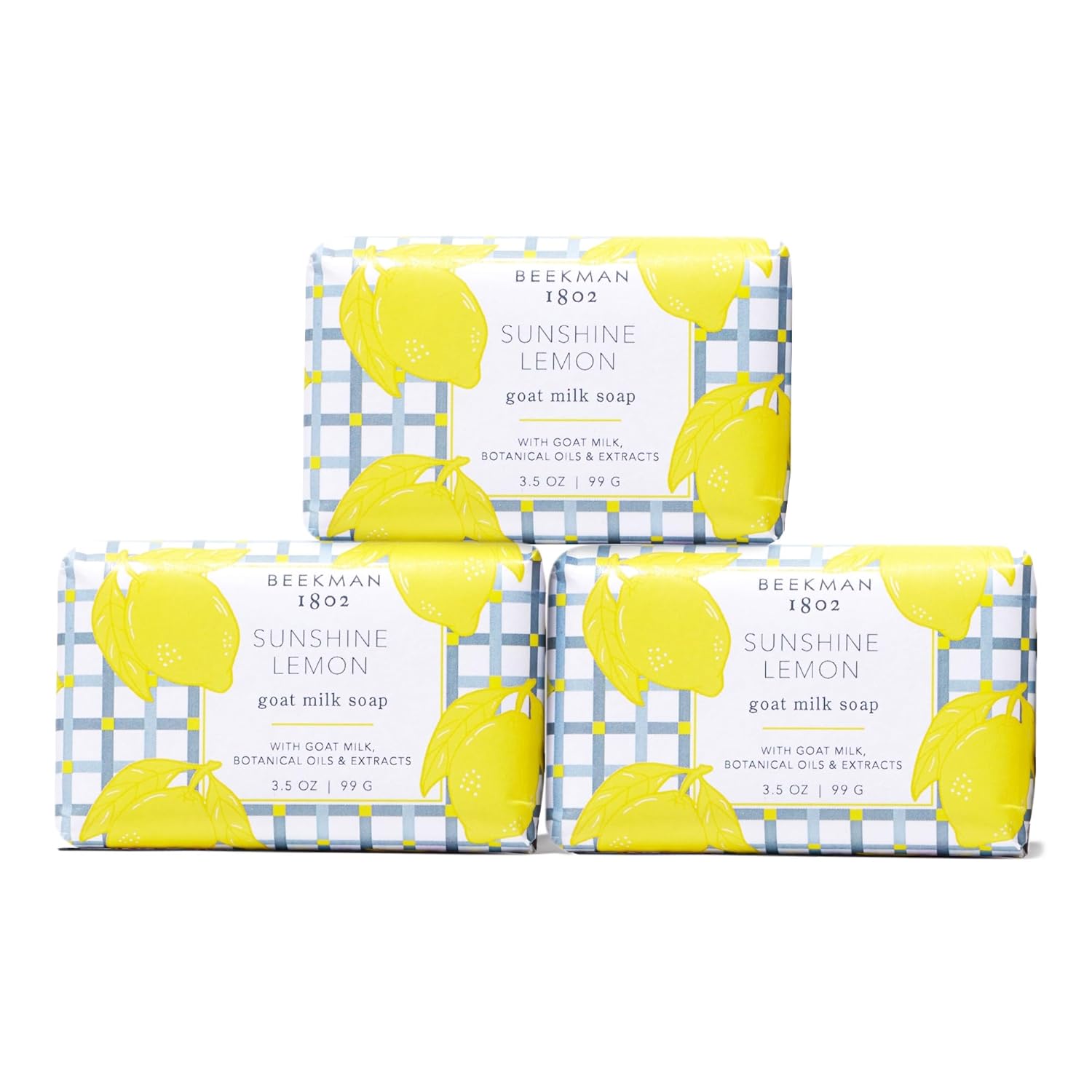 Beekman 1802 Goat Milk Body Soap Bar 3-Piece Set, Sunshine Lemon - Scented - 3.5 Oz - Nourishes, Moisturizes & Hydrates - 100% Vegetable Soap With Lactic Acid - Good For Sensitive Skin - Cruelty Free