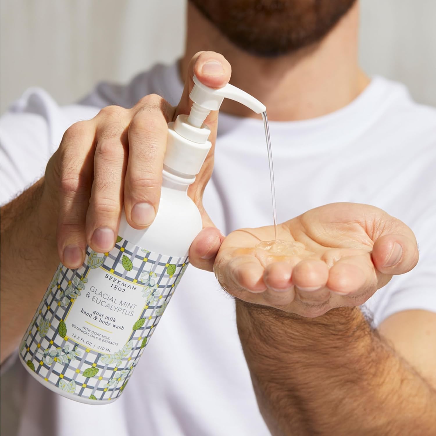 About this item HAND & BODY WASH - This ultra-nourishing wash blends skin-loving goat milk and soothing aloe vera to gently cleanse and deliver hydration back into the skin, while the scent of cool mint and eucalyptus instantly refreshes. KEY INGREDIENTS - Goat milk gently exfoliates, aloe vera soothes dry skin and irritation, and jojoba seed oil delivers intense moisture while cleansing. THE GOAT MILK DIFFERENCE - Rich in lactic acid (a natural exfoliant), vitamins & minerals, goat milk has the same pH as human skin! It helps keep the microbiome well-balanced and prevents visible signs of irritation, sensitivity & premature aging. BEYOND CLEAN - Our formula is free from toxins & harsh ingredients known to irritate sensitive skin, including parabens, sulfates, phthalates, synthetic colors & fragrances, abrasive exfoliant particles, and microplastics. CLINICALLY KIND - Clinically Kind is the Beekman 1802 approach to skincare. Our effective, cruelty-free formulations are clinically tested, scientifically proven & made to work with your skin, not against it. FORMULATED WITH KINDNESS - Starting with a herd of 100 goats, we unlocked the science behind goat milk—a centuries-old natural remedy that’s Kind to sensitive skin—and grew from one bar of soap into the world’s largest goat-milk skincare company. See more product details,HAND & BODY WASH - This ultra-nourishing wash blends skin-loving goat milk and soothing aloe vera to gently cleanse and deliver hydration back into the skin, while the scent of cool mint and eucalyptus instantly refreshes,KEY INGREDIENTS - Goat milk gently exfoliates, aloe vera soothes dry skin and irritation, and jojoba seed oil delivers intense moisture while cleansing,THE GOAT MILK DIFFERENCE - Rich in lactic acid (a natural exfoliant), vitamins & minerals, goat milk has the same pH as human skin! It helps keep the microbiome well-balanced and prevents visible signs of irritation, sensitivity & premature aging,BEYOND CLEAN - Our formula is free from toxins & harsh ingredients known to irritate sensitive skin, including parabens, sulfates, phthalates, synthetic colors & fragrances, abrasive exfoliant particles, and microplastics,CLINICALLY KIND - Clinically Kind is the Beekman 1802 approach to skincare. Our effective, cruelty-free formulations are clinically tested, scientifically proven & made to work with your skin, not against it,FORMULATED WITH KINDNESS - Starting with a herd of 100 goats, we unlocked the science behind goat milk—a centuries-old natural remedy that’s Kind to sensitive skin—and grew from one bar of soap into the world’s largest goat-milk skincare company