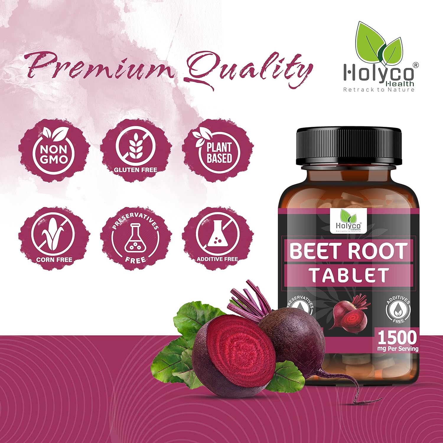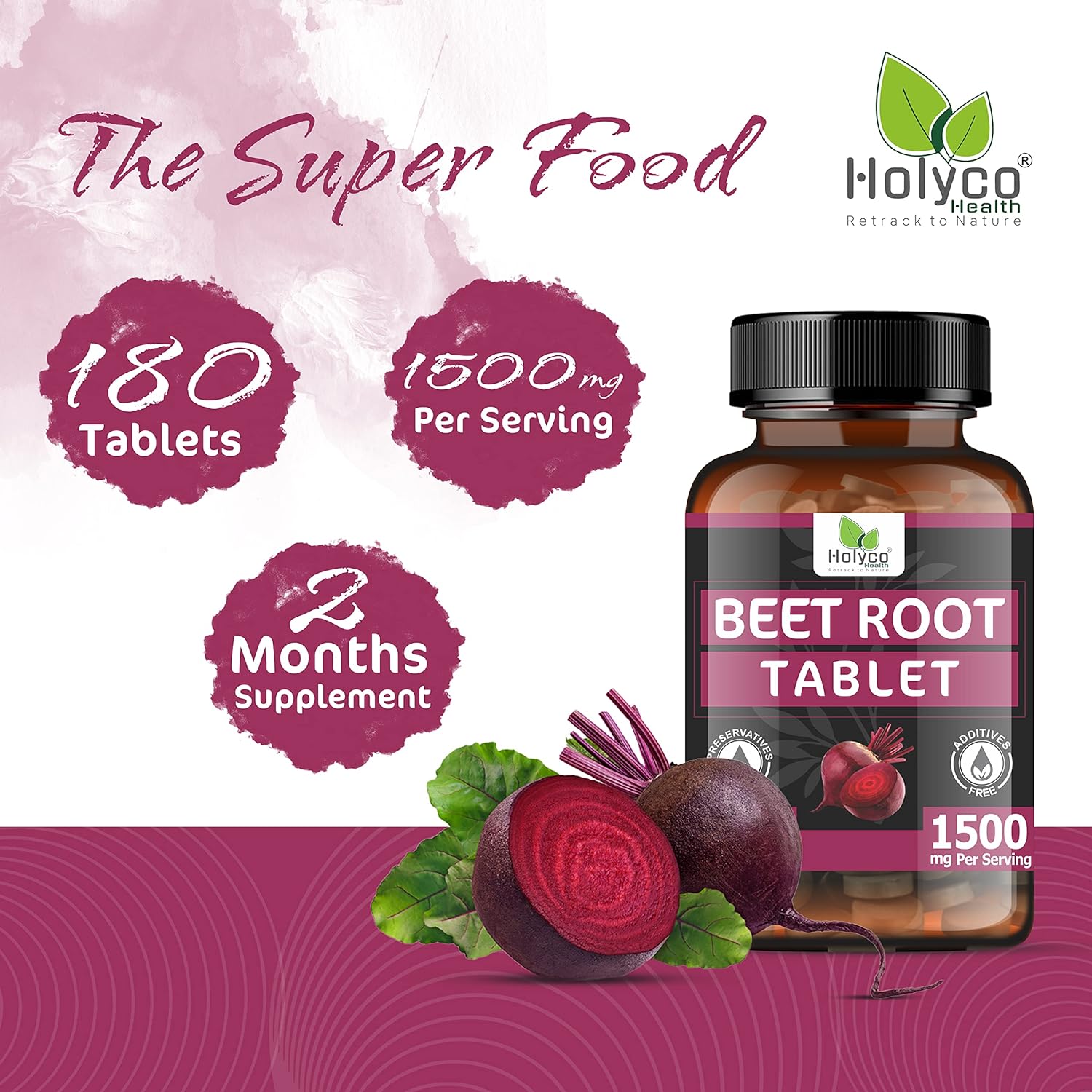 Holyco health’s Beet Root Tablet rich in dietary fiber, calcium, iron, potassium, folate (Vitamin B9) and manganese, Beetroot provides numerous health benefits and increased exercise performance10NITRIC OXIDE SUPERFOOD - Rich in nitrates, Beet Root Tablet helps to dilate blood vessels, which increases blood and oxygen flow throughout the body. It aids in detoxification - clear out the bad stuff so your body can invest more energy up taking and using the good stuff10IMPROVES ATHLETIC PERFORMANCE : If you’re interested in using beets to improve your fitness routine, take them like a pre-workout supplement10GET NATURAL ENERGY BOOST – Take 1 tablet in 3 times a day or take 3 tablets at a time in a day as per our conventions or health practitioner1010Beets are incredibly nutrient-dense, especially when it comes to vitamins and minerals. Beet root tablet naturally contains high amount of nitrates, folate, manganese, potassium, iron, and vitamin C10