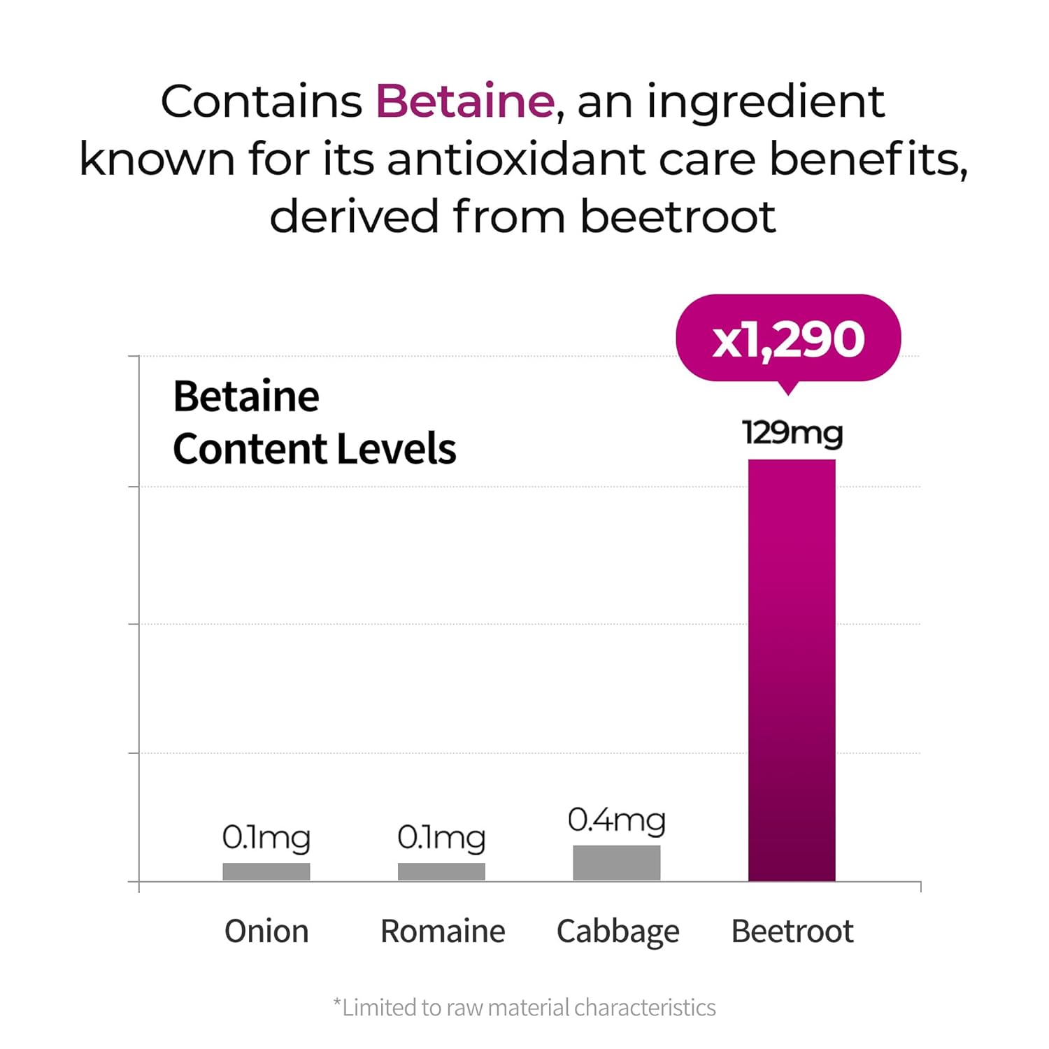 Contains 10,000 Ppm Of Rebornic, A Powerful Ingredient With An Optimal Ratio To Enhance Calcium Absorption, Along With Whole Beetroot Extract. The Beetroot’S Betaine, A Potent Antioxidant, Is Rich In Vitamins, Minerals, And Anthocyanins, Providing Nourishment And Revitalizing The Skin For A Healthy, Radiant Glow