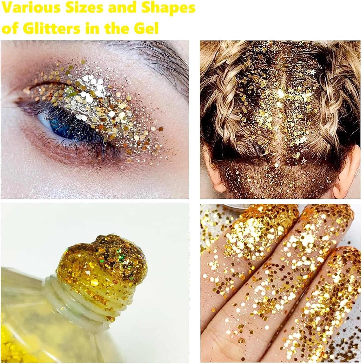 Beliky Girl Body Glitter Gel, 50Ml Face Glitters Body Gel Sequins Shimmer Liquid Eyeshadow, Mermaid Sequins Liquid Holographic Glitter Gel, Chunky Glitter For Face Hair Nails (Gold)