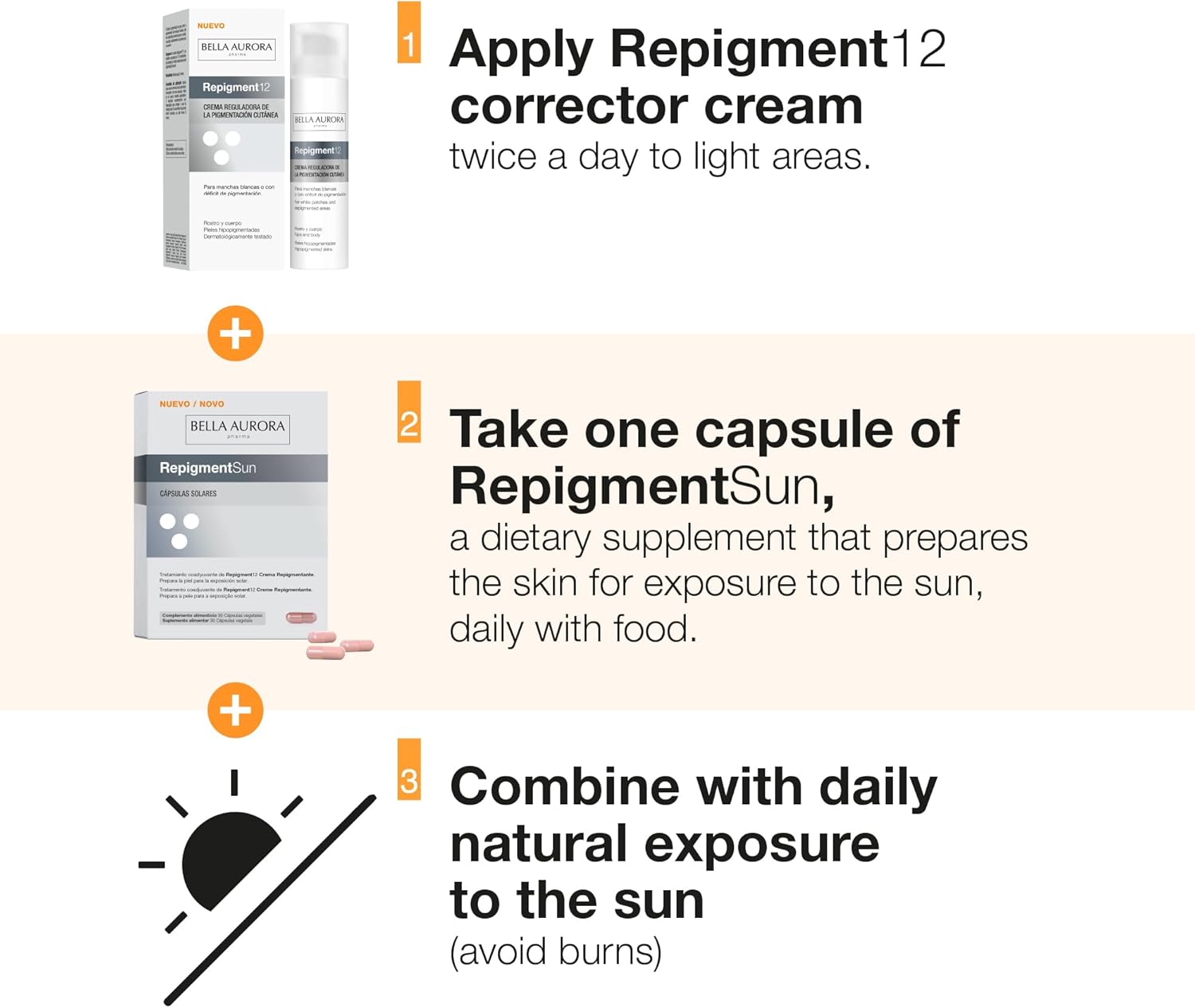 Bella Aurora, Repiment12 & Repigmentsun, Repigmenting Solution, Cosmetic Treatment Of Hypopigmentation Or White Patches On The Skin (Repigment12 Cream)