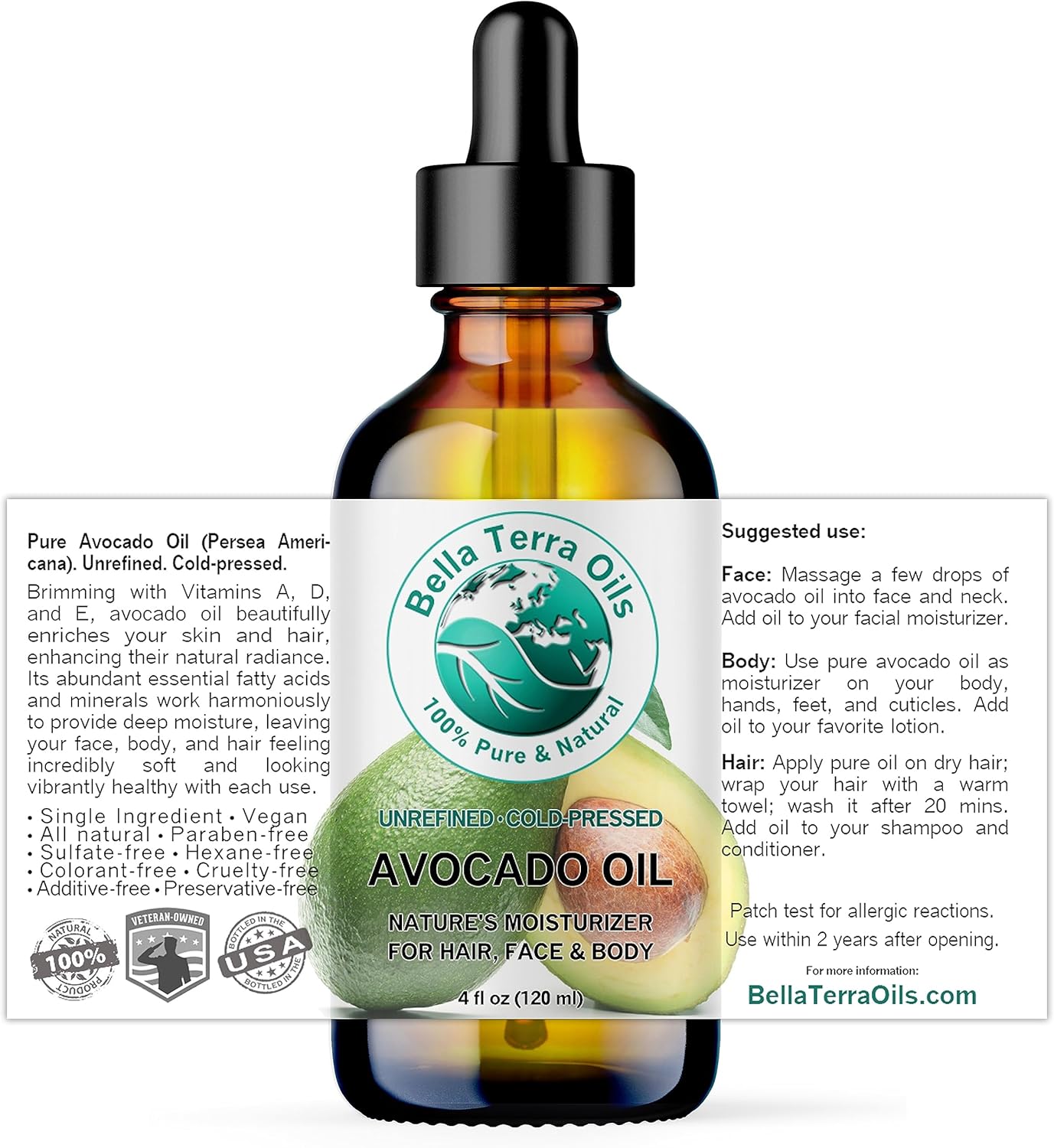 Bella Terra Oils - Avocado Oil 4 oz - Dive into The Purity of Natural Avocado, Abundant in Vitamin K & C, Superior Blend for Essential Oils