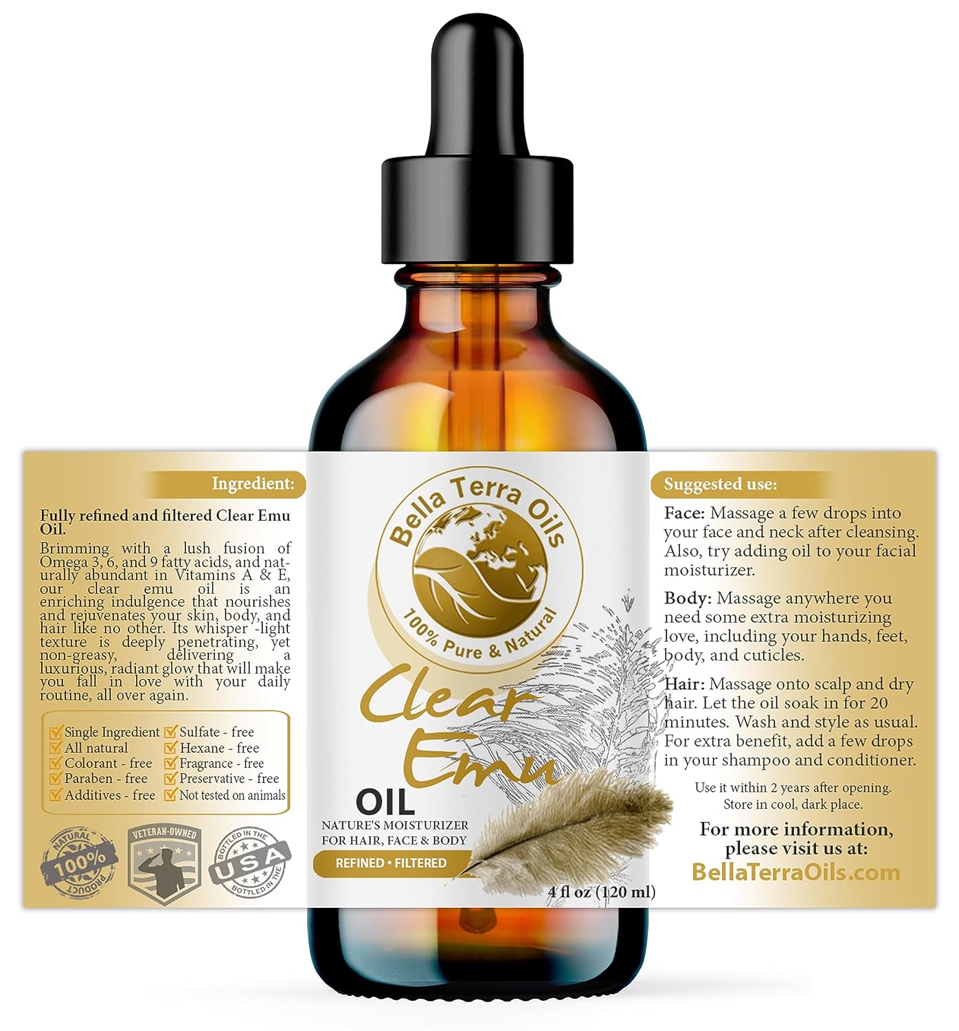Bella Terra Oils - Clear Emu Oil 4oz - Inspired by Nature's Perfection, High in Omega-3 & Omega-6 Acids, Skin's Best Companion for Moisturization