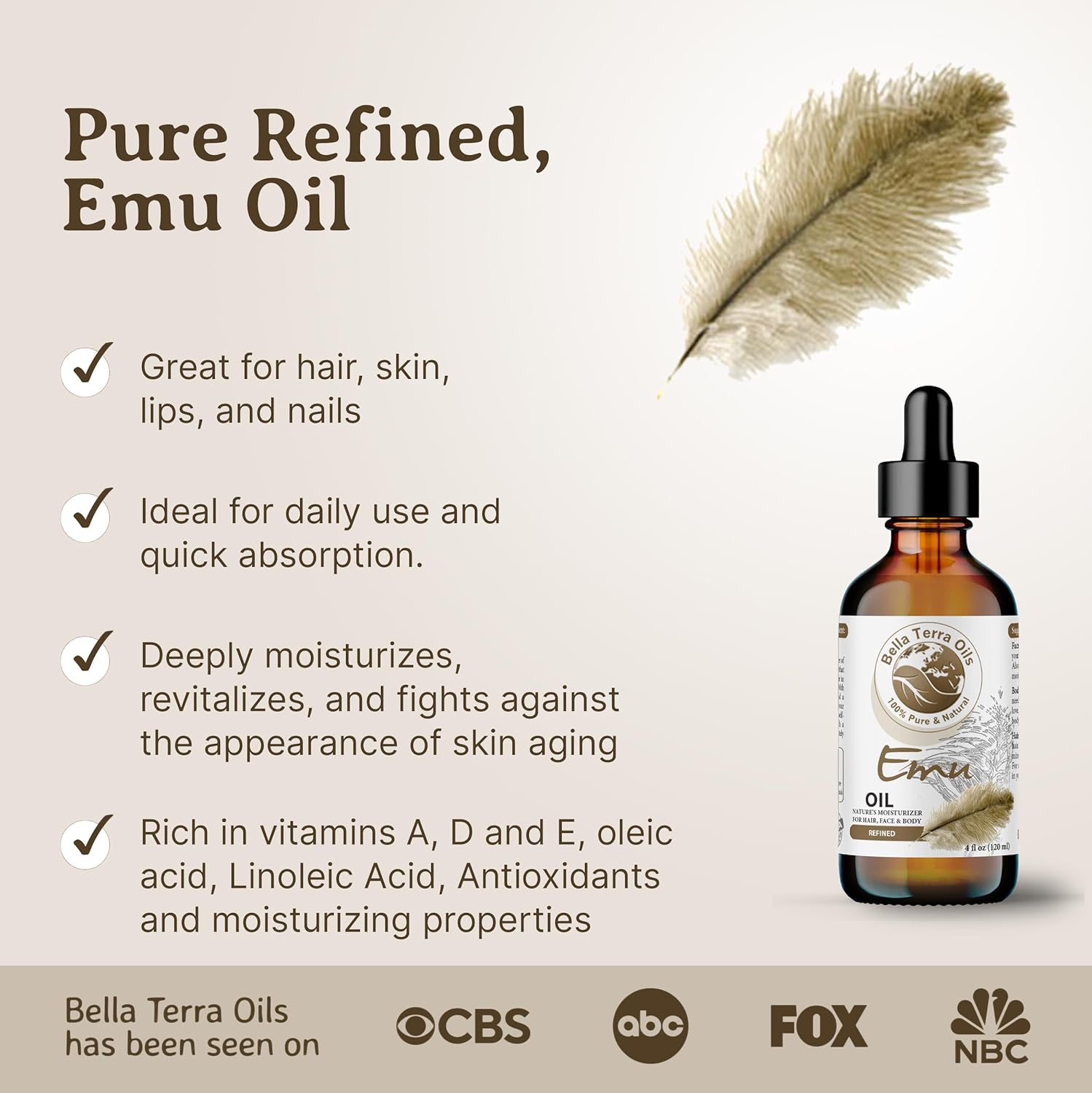 [Benefit-Rich Nature]: Emu Oil is a natural boon for skin and hair, perfect for enhancing massages, and an essential addition to your aromatherapy blends