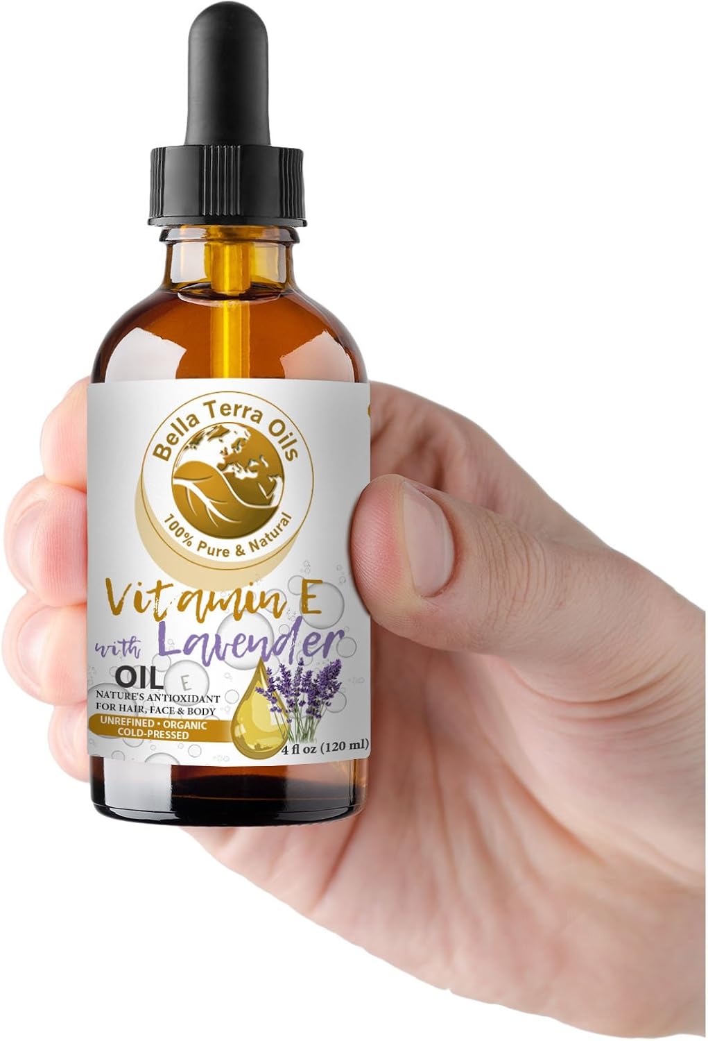 Bella Terra Oils - Lavender Infused Organic Vitamin E Oil 4oz - D-Alpha Tocopherol Richness, Masterfully Blended with Lavender, from Organic Wheat Germ to Your Skin