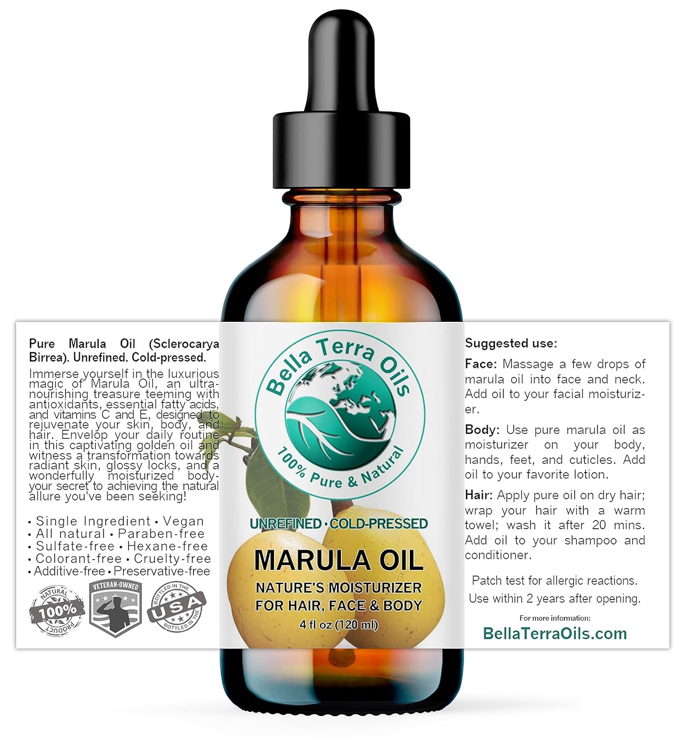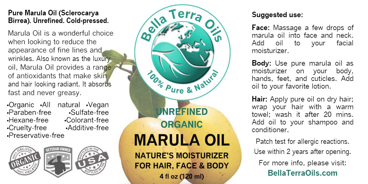 Bella Terra Oils - Marula Oil for Skin 4 oz - Dive into the Nutritional Excellence, Abundant in Vitamin C & Antioxidants, Perfect Companion for Your Face