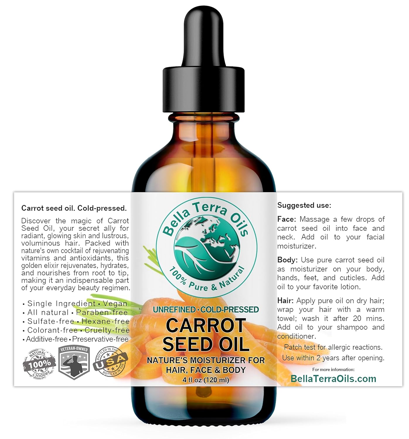 Bella Terra Oils - Organic Carrot Seed Oil 4 oz - Dive into Carotene's Natural Power, High in Essential Fatty Acids, Experience Luxurious Skin Nourishment