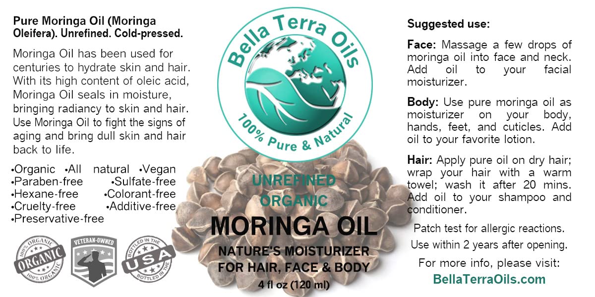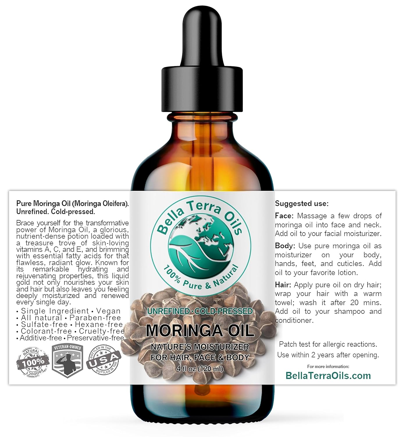 Bella Terra Oils - Organic Moringa Oil 4 oz - Celebrating Pure Premium Organic Moringa, Enriched with Antioxidants, Best for Nourishing Skin’s Natural Glow
