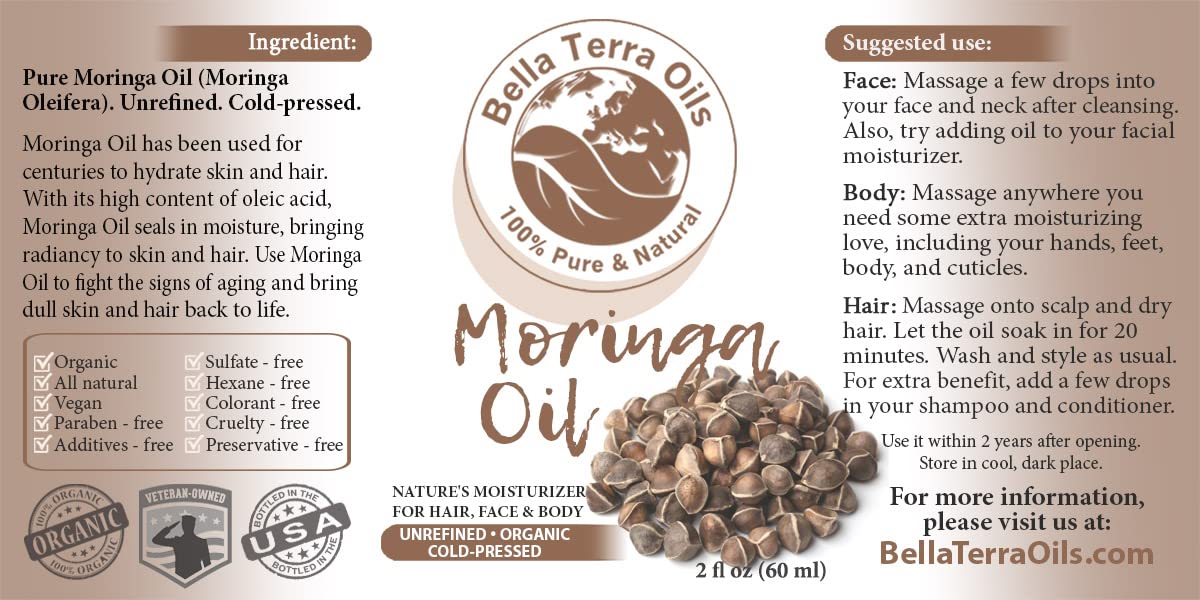 Bella Terra Oils - Organic Moringa Seed Oil 2oz - A Blend of Nature's Best, High in Oleic Acid & Vitamin E, For a Touch of Luxurious Smoothness