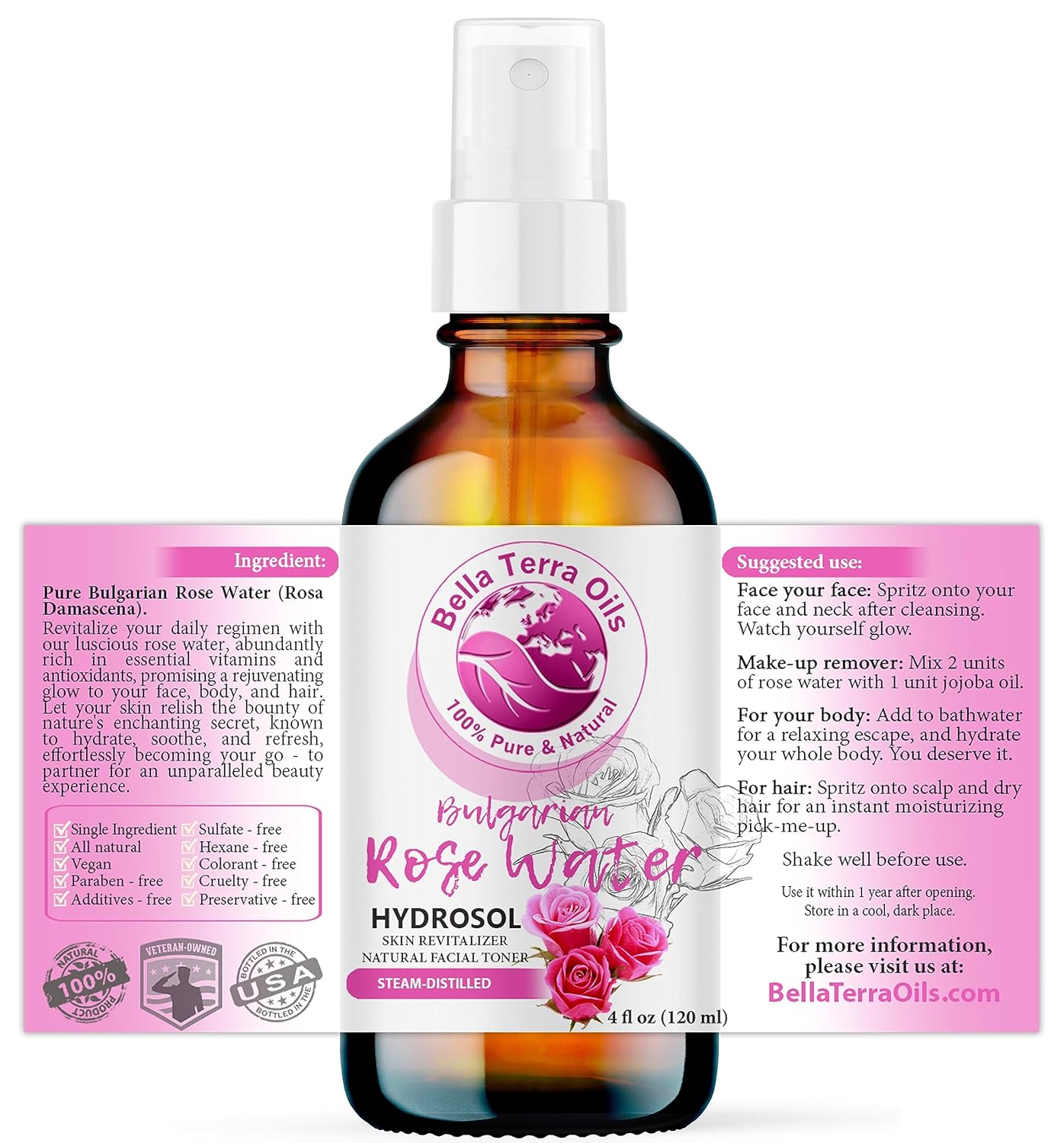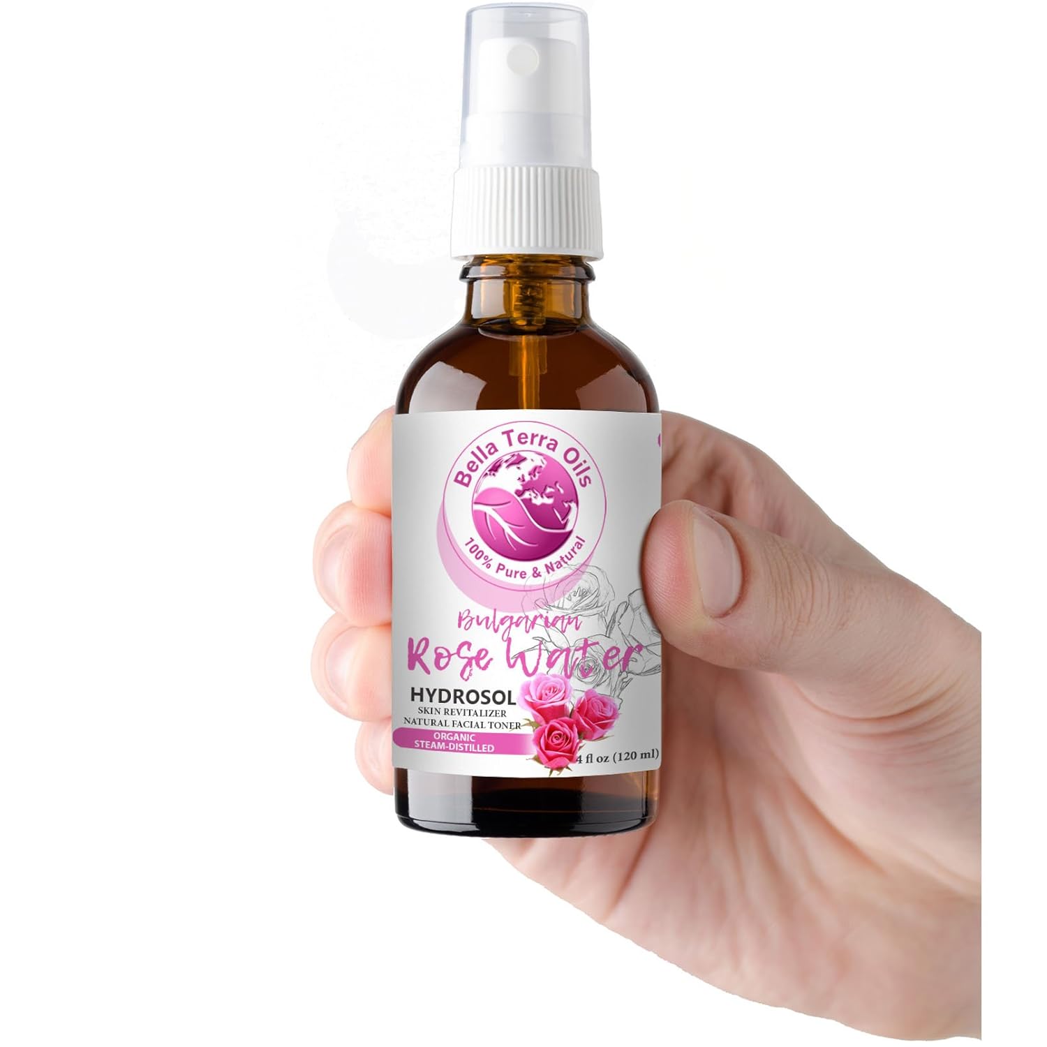 Bella Terra Oils - Organic Rose Water Spray 4oz - Dive into The Elixir of Rose Hydrosol, Gentle on Skin, Luxurious Rosewater Toner Face Experience