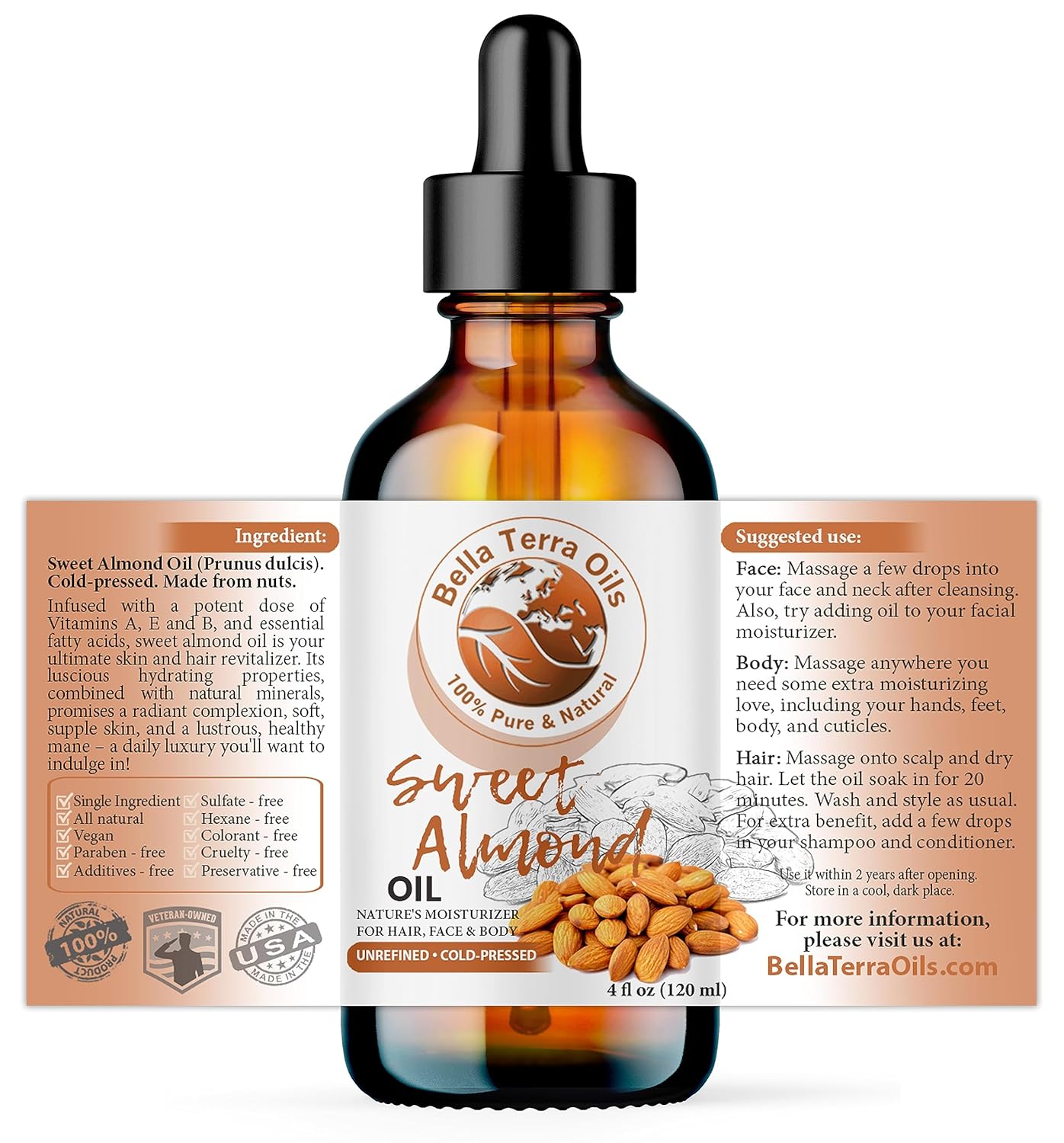 Bella Terra Oils - Organic Sweet Almond Oil 4oz - A Symphony of Vitamin E & Oleic Acid, Pure Cold-Pressed Essence, Luxe Touch for Skin