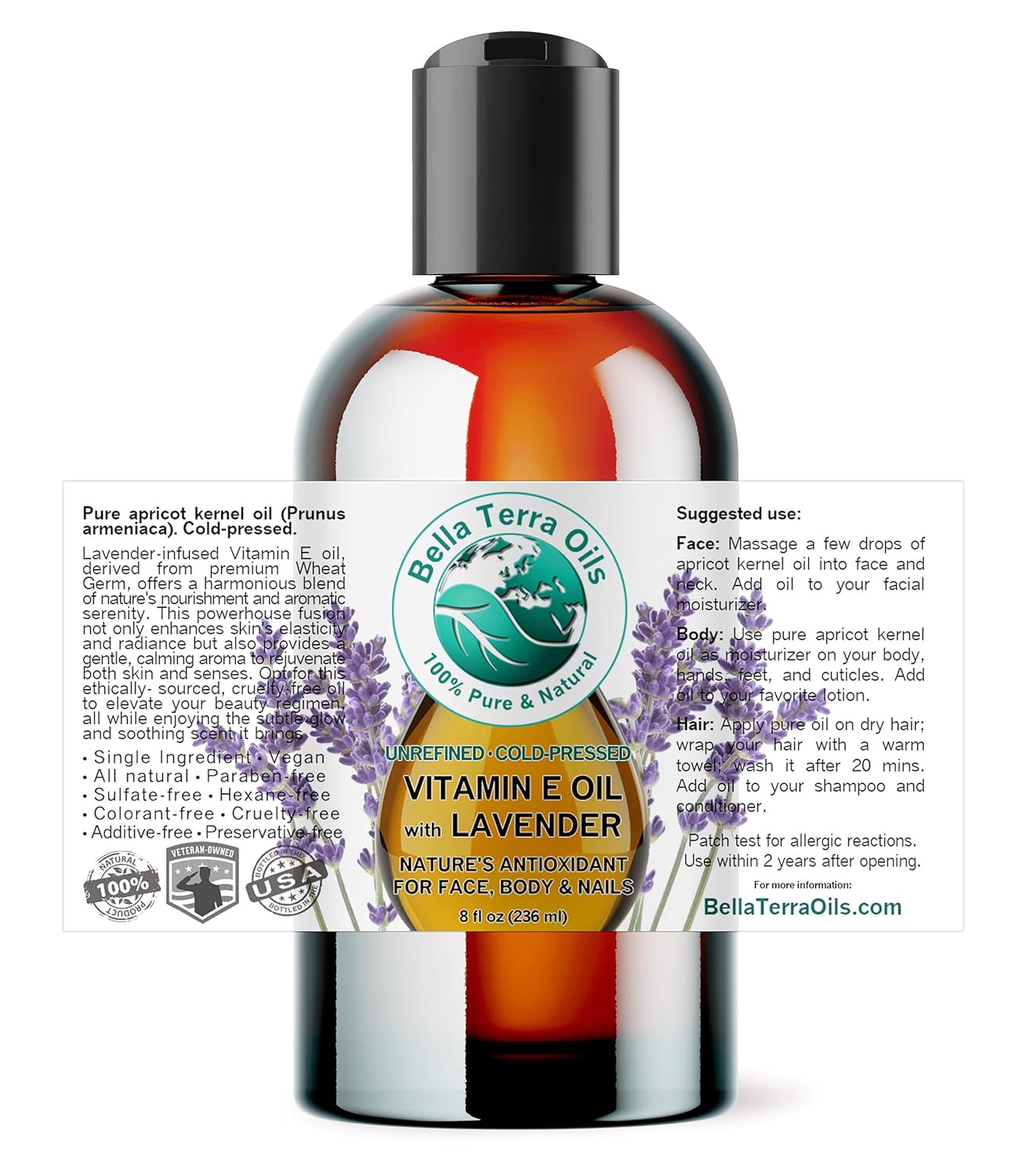 Bella Terra Oils - Organic Vitamin E & Lavender Oil 8 oz - Exquisite Face Elixir with Pure D-Alpha Tocopherol, Organic Wheat Germ Extracted, Enchanting Lavender Essence for Your Skin