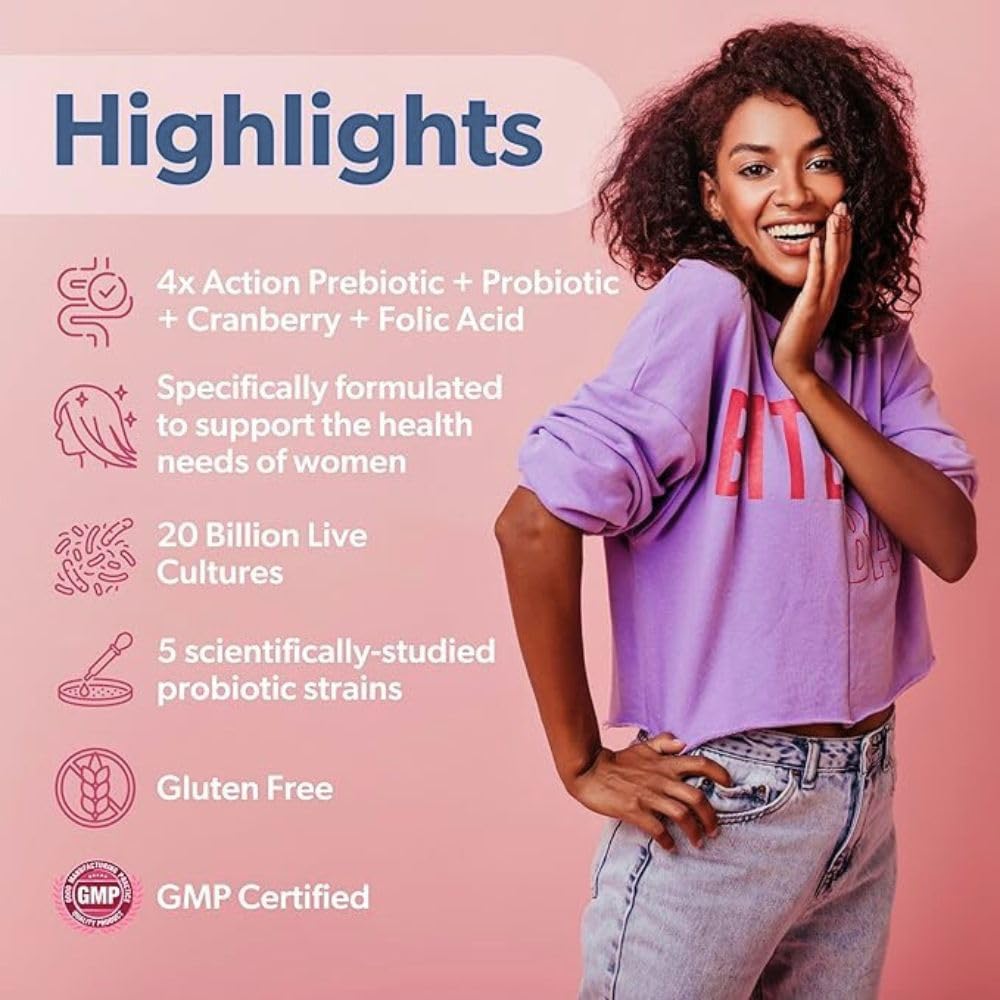 About this item Women's Probiotic to support digestive, vaginal, urinary and reproductive health Doctor recommended 4 in 1 prebiotic, probiotic, cranberry & folic acid supplement - take one capsule daily with food 5 scientifically studied probiotic strains specifically formulated to promote a healthy pH balance 20 billion live cultures to promote a healthy microbiome - shelf stable, no need to refrigerate Family-owned with a passion to help people improve their health with probiotics since 1967 › See more product details,Women's Probiotic to support digestive, vaginal, urinary and reproductive health,Doctor recommended 4 in 1 prebiotic, probiotic, cranberry & folic acid supplement - take one capsule daily with food,5 scientifically studied probiotic strains specifically formulated to promote a healthy pH balance,20 billion live cultures to promote a healthy microbiome - shelf stable, no need to refrigerate,Family-owned with a passion to help people improve their health with probiotics since 1967