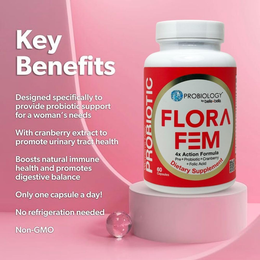 Belle+Bella Probiology Flora Fem - Daily Probiotics For Women - 4X Action Prebiotic + Probiotic + Cranberry + Folic Acid For Digestive, Urinary Tract, Reproductive & Vaginal Health - 60 Caps