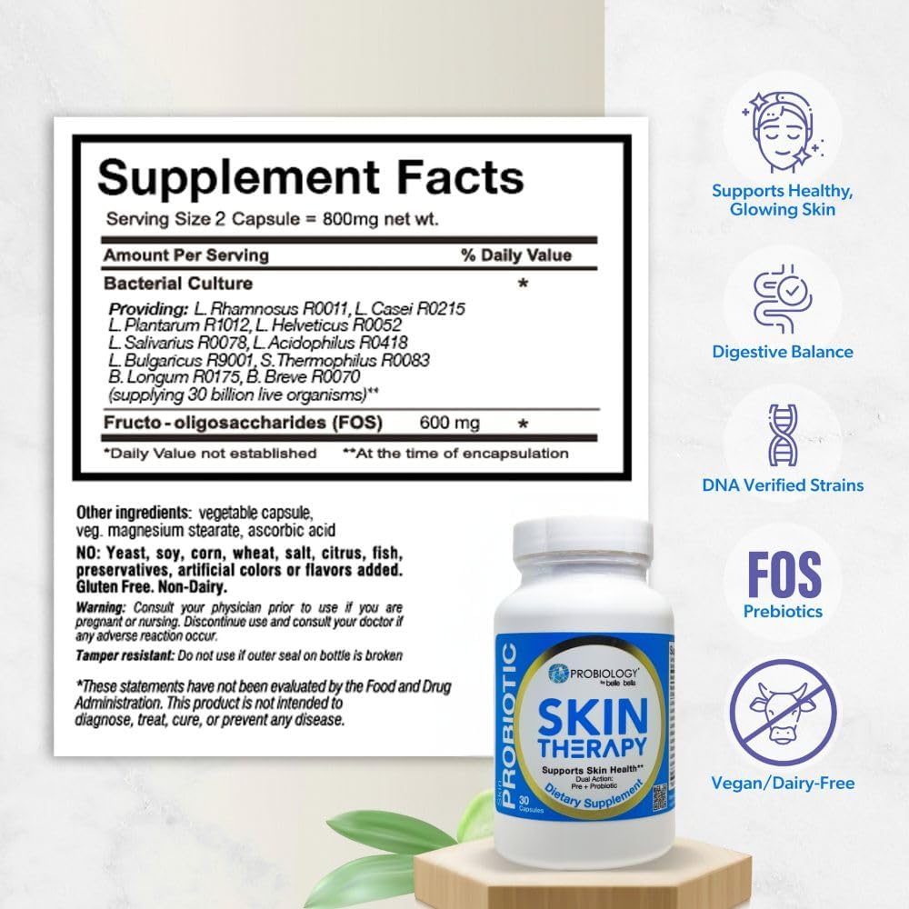 Belle+Bella Probiotic Skin Therapy - Dual Action Probiotic & Prebiotic Supplement For Healthy, Glowing Skin From Within - Non-Gmo, Vegan & Gluten Free - 30 Caps