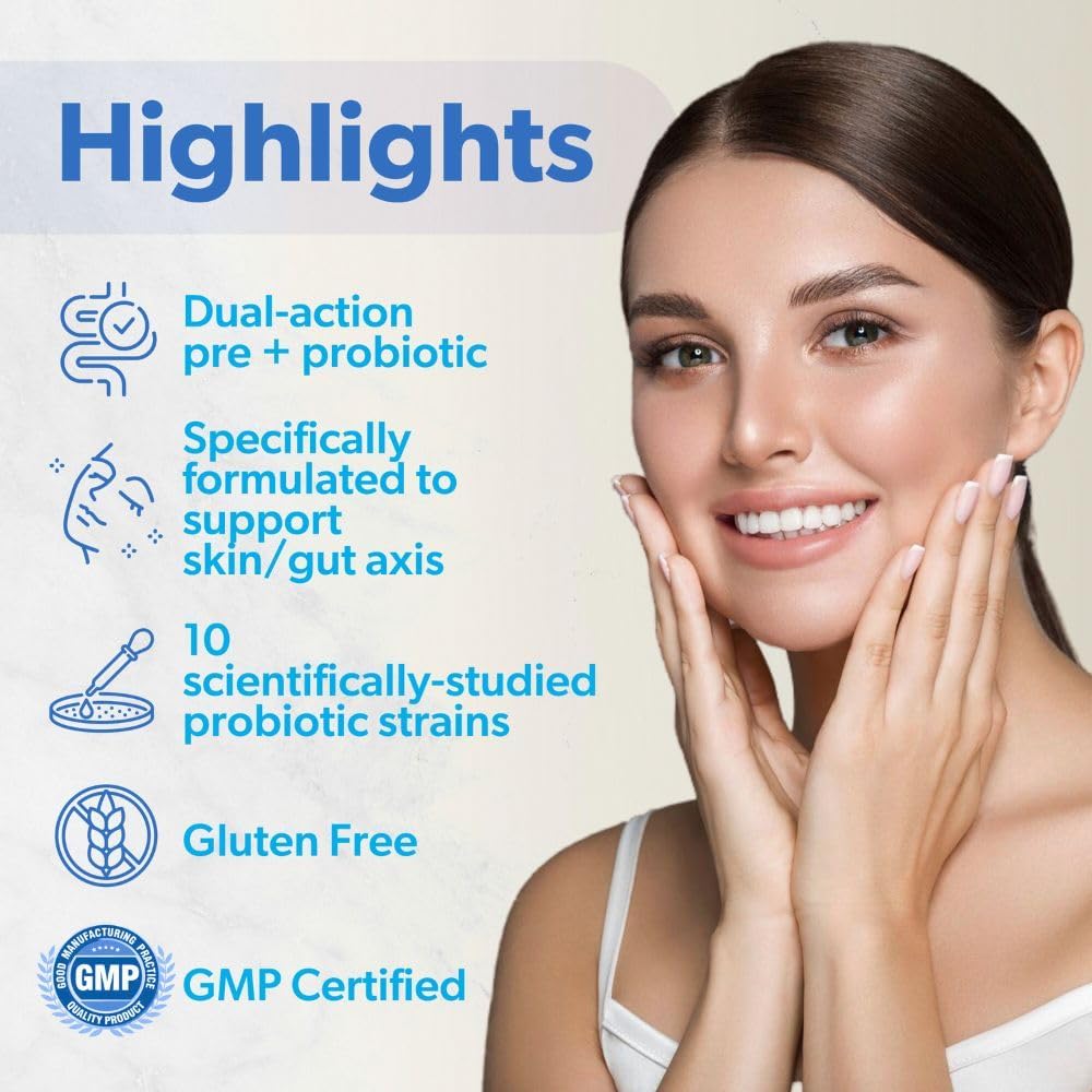 About this item Beauty from within- probiotics for women & men to restore digestive balance & promote naturally healthy skin 10 scientifically studied probiotic strains specifically formulated for clear skin 30 Billion live cultures to promote a healthy microbiome - Shelf Stable no refrigeration needed Probiotic + Prebiotic to support skin gut axis Family-owned with a passion to help people improve their health with probiotics since 1967 › See more product details,Beauty from within- probiotics for women & men to restore digestive balance & promote naturally healthy skin,10 scientifically studied probiotic strains specifically formulated for clear skin,30 Billion live cultures to promote a healthy microbiome - Shelf Stable no refrigeration needed,Probiotic + Prebiotic to support skin gut axis,Family-owned with a passion to help people improve their health with probiotics since 1967
