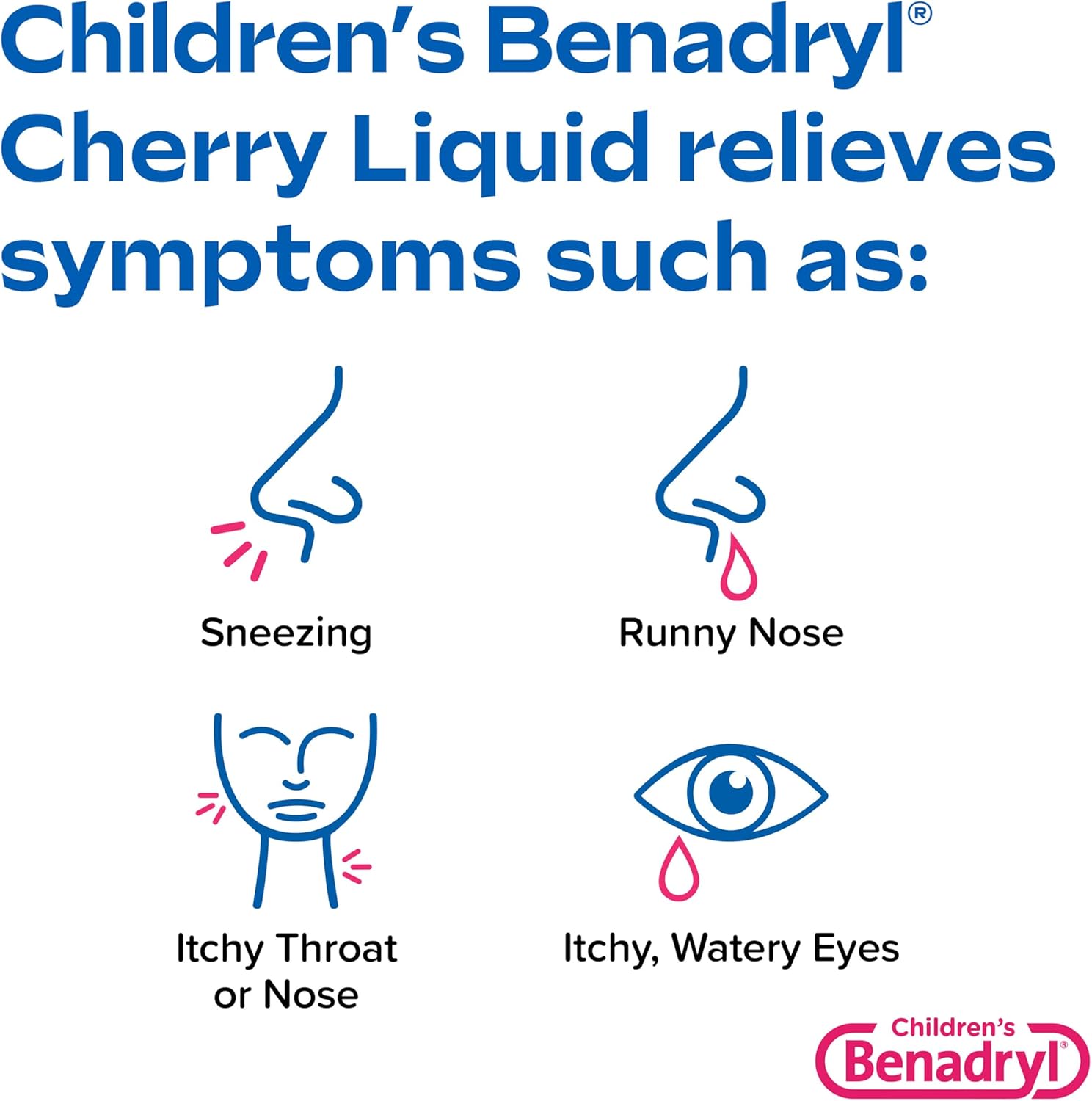 About this item 8-fl. oz of Children's Benadryl Allergy Liquid in cherry flavor is specially formulated to provide temporary relief of allergy symptoms caused by hay fever and other upper respiratory allergies This allergy medicine for kids contains 12.5 mg of diphenhydramine HCl per teaspoon (5 mL) dose, an antihistamine that works to help alleviate children's allergy symptoms so they can start feeling more like themselves From the brand moms turn to first when they first treat their children's upper respiratory allergies, this children's allergy medicine helps your child feel better when they need it most by easing symptoms with its alcohol-free formula Antihistamine for kids is specially formulated to relieve allergy symptoms caused by hay fever and other upper respiratory allergies including runny nose, sneezing, itching of nose or throat, and itchy, watery eyes Children's allergy liquid medicine is available in a tasty, kid-friendly cherry flavor and comes with a convenient dosing cup to help give your child's allergies a time out See more product details,8-fl. oz of Children's Benadryl Allergy Liquid in cherry flavor is specially formulated to provide temporary relief of allergy symptoms caused by hay fever and other upper respiratory allergies,This allergy medicine for kids contains 12.5 mg of diphenhydramine HCl per teaspoon (5 mL) dose, an antihistamine that works to help alleviate children's allergy symptoms so they can start feeling more like themselves,From the brand moms turn to first when they first treat their children's upper respiratory allergies, this children's allergy medicine helps your child feel better when they need it most by easing symptoms with its alcohol-free formula,Antihistamine for kids is specially formulated to relieve allergy symptoms caused by hay fever and other upper respiratory allergies including runny nose, sneezing, itching of nose or throat, and itchy, watery eyes,Children's allergy liquid medicine is available in a tasty, kid-friendly cherry flavor and comes with a convenient dosing cup to help give your child's allergies a time out