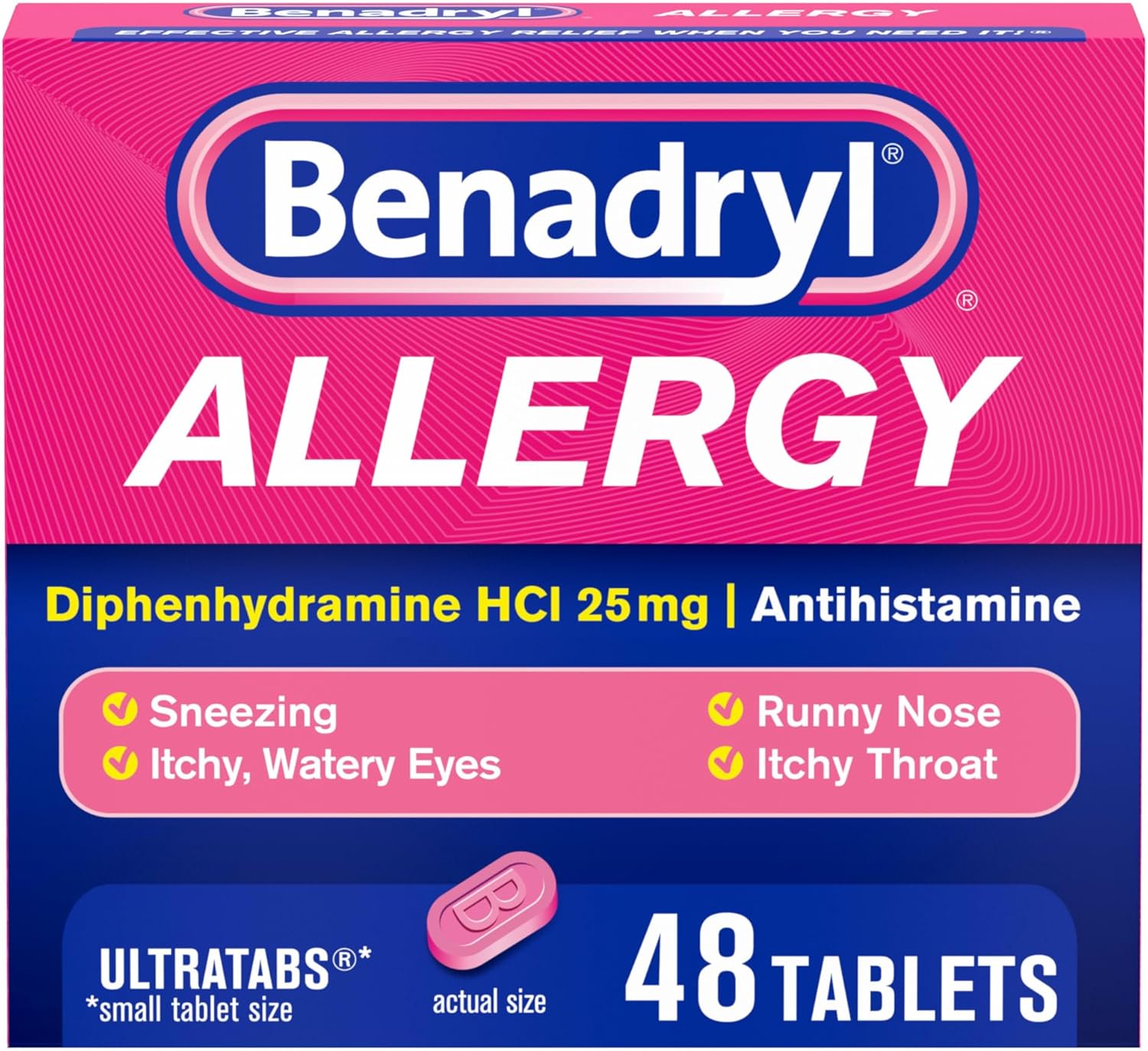 About this item 48-count pack of Benadryl Ultratabs Antihistamine Allergy Relief Tablets with 25 mg diphenhydramine HCl for powerful allergy & cold relief in 1 pill* *temporarily relieves runny nose & sneezing due to upper respiratory allergies or the common cold The small, oval shaped coated tablets with the antihistamine diphenhydramine HCl provides relief for hay fever or other upper respiratory allergy symptoms & cold symptoms like sneezing & runny nose Effective & powerful multi-symptom allergy relief for unexpected allergies from an allergist recommended brand. Works when you need it most. A trusted allergy brand, Benadryl Ultratabs provide powerful relief for unexpected allergies & relieves symptoms like sneezing, runny nose & itchy, watery eyes & cold symptoms like sneezing & runny nose Allergy medicine from a doctor recommended brand for safe & effective*** allergy relief in a small, easy-to-swallow tablet form to be used by adults & children ages six & up for relief of both indoor & outdoor allergies ***when used as directed See more product details,48-count pack of Benadryl Ultratabs Antihistamine Allergy Relief Tablets with 25 mg diphenhydramine HCl for powerful allergy & cold relief in 1 pill* *temporarily relieves runny nose & sneezing due to upper respiratory allergies or the common cold,The small, oval shaped coated tablets with the antihistamine diphenhydramine HCl provides relief for hay fever or other upper respiratory allergy symptoms & cold symptoms like sneezing & runny nose,Effective & powerful multi-symptom allergy relief for unexpected allergies from an allergist recommended brand. Works when you need it most,A trusted allergy brand, Benadryl Ultratabs provide powerful relief for unexpected allergies & relieves symptoms like sneezing, runny nose & itchy, watery eyes & cold symptoms like sneezing & runny nose,Allergy medicine from a doctor recommended brand for safe & effective*** allergy relief in a small, easy-to-swallow tablet form to be used by adults & children ages six & up for relief of both indoor & outdoor allergies ***when used as directed