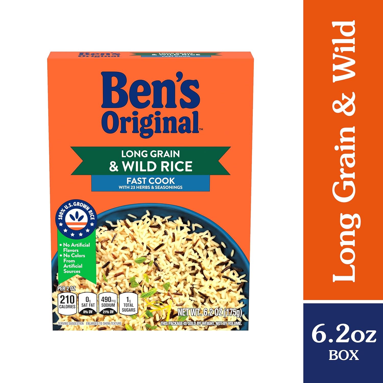 Twelve 6.2 oz boxes of BEN'S ORIGINAL Long Grain Rice and Wild Rice10Boxed rice blend contains 23 herbs and seasonings to bring a savory accent to your rice dishes10Flavored mix or wild rice and long grain rice meshes well with myriad cooked rice meals, making it easy to explore new recipes and possibilities10Use BEN'S ORIGINAL Long Grain and Wild Rice as an appetizing side dish or together with braised beef in an exciting hunter's stew recipe10Fast-cooking rice mix that prepares in 10 minutes to help you save time for more precious moments with your loving family10BEN'S ORIGINAL Long Grain and Wild Rice makes every dish a bit more special with a mix of 23 herbs and seasonings. A delectable blend of long grain rice and wild rice works perfectly together to bring a flavorful punch to cooked rice meals — explore endless culinary possibilities with a variety of savory rice recipes or go for a yummy side dish that your family will assuredly love. When the hectic schedule of a busy lifestyle stands in the way, combine your long grains and wild rice with water in a saucepan, boil, and let the contents simmer for about 10 minutes. If you want a hint of extra flavor, add one tablespoon of butter and stir well. Microwaves and rice cookers also work wonders for this flavored rice blend that prepares quickly and tastes deliciously. For any time of the year, consider a wild rice salad with beets and pecans to brighten up your lunches. Alternatively, prepare a tried-and-true recipe by making a chicken noodle and wild rice soup paired with fresh onions and topped with parsley. BEN'S ORIGINAL Rice doesn't contain any artificial flavors and no colors from artificial sources, so you can always enjoy high-quality, wholesome rice meals with your loved ones. BEN'S ORIGINAL is dedicated to creating meals and experiences that offer everyone a seat at the table