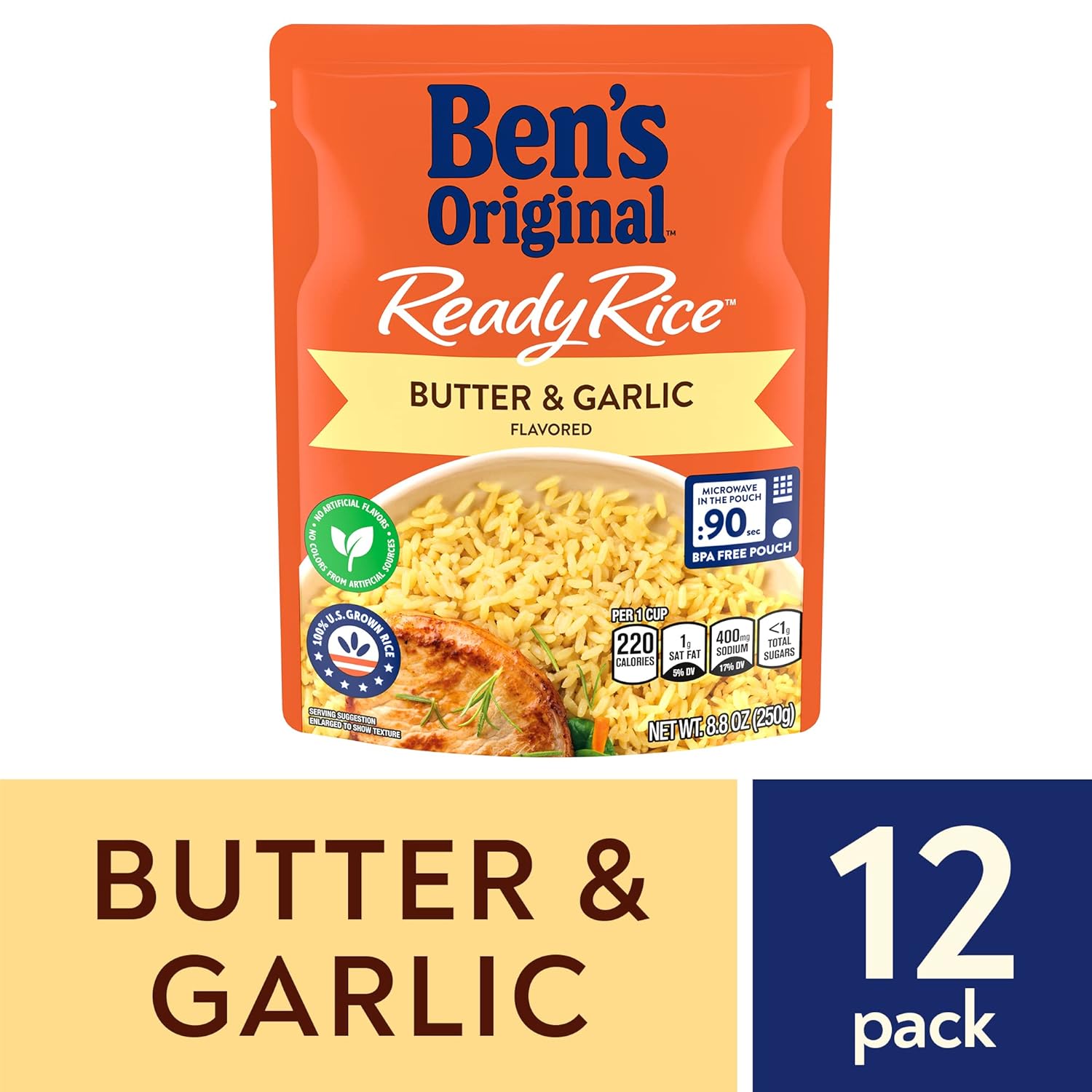Twelve 8.8 oz pouches of BEN'S ORIGINAL Ready Rice Butter and Garlic Flavored Rice10Microwave rice pouch with delicious seasoned parboiled rice that comes pre-cooked and is ready to serve in only 90 seconds10Contains long grain rice with creamy butter and aromatic garlic for a tasty cooked rice meal packed with flavor10Pair this seasoned rice with your favorite meats, use it to prepare savory recipes or serve it plain10Place the pouch in the microwave and cook it for 90 seconds, or pour the contents into a skillet and heat thoroughly10BEN'S ORIGINAL Ready Rice Butter and Garlic Flavored Rice offers delicious seasoned parboiled rice that comes pre-cooked and is ready to serve in only 90 seconds. Perfect as part of a main course or as an easy rice side dish, this microwave rice pouch delivers long grain rice with creamy butter and aromatic garlic for a tasty cooked rice meal packed with flavor. BEN'S ORIGINAL Ready Rice comes in a BPA-free microwavable rice pouch that makes cooking easier by eliminating prep and cleanup. To enjoy great-tasting butter and garlic rice, place the pouch in the microwave and cook it for 90 seconds. You can also pour the contents into a skillet and heat thoroughly until it's ready to serve. Pair this seasoned rice with your favorite meats, use it to prepare savory recipes or serve it plain. This seasoned rice is vegetarian, contains no artificial flavors, no colors from artificial sources, no trans fat, or cholesterol. BEN'S ORIGINAL is dedicated to creating meals and experiences that offer everyone a seat at the table