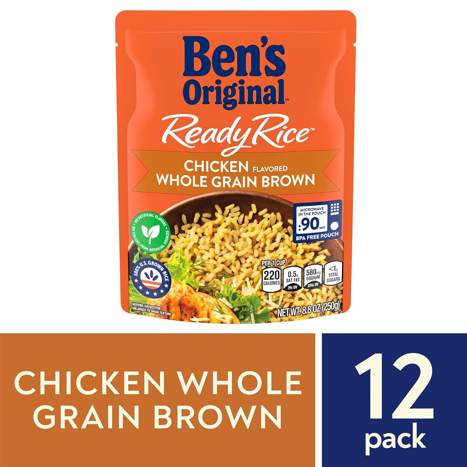 Twelve 8.8 oz pouches of BEN'S ORIGINAL Ready Rice Chicken Flavored Whole Grain Brown Rice10Wholesome microwave rice helps you spend less time in the kitchen so you can enjoy a delicious cooked rice meal in minutes10Each flavored rice pouch contains 100% whole brown rice with a hearty chicken flavor10Pair this seasoned parboiled rice with your favorite meats, serve it plain, or use it as a base for easy recipes10Place the rice pouch in the microwave and cook for 90 seconds, or thoroughly heat the contents of the pouch in a skillet until ready to serve10BEN'S ORIGINAL Ready Rice Chicken Flavored Whole Grain Brown Rice is a wholesome parboiled rice option to help you spend less time in the kitchen so you can enjoy a delicious cooked rice meal in minutes. This chicken flavored rice side dish comes fully cooked, offering a hearty and comforting taste that is perfect for sharing or eating on your own. Available in a BPA-free microwavable rice pouch, BEN'S ORIGINAL Ready Rice eliminates prep and cleanup for fast and effortless cooking. Place the whole grain rice pouch in the microwave and cook it for 90 seconds, or thoroughly heat the contents of the pouch in a skillet until ready to serve. Pair this seasoned rice with your favorite meats, serve it plain, or use it as a base for easy recipes. This flavored rice is made with 100% whole grains and contains no artificial flavors, no colors from artificial sources, and no trans fat. BEN'S ORIGINAL is dedicated to creating meals and experiences that offer everyone a seat at the table