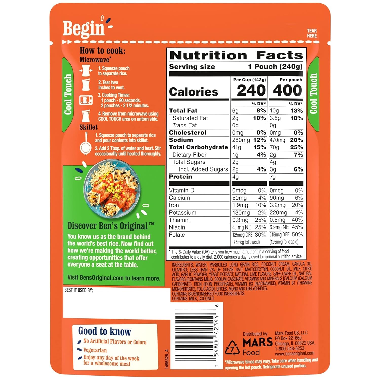 Twelve 8.5 oz pouches of BEN'S ORIGINAL Ready Rice Cilantro Lime Flavored Rice10Enhance any cooked rice meal in minutes with this convenient microwave rice10Fully precooked long grain rice with fresh pops of cilantro and a bright, flavorful lime finish10This parboiled rice side dish tastes great with tacos or served plain with your favorite protein10Cook the rice in the microwave for 90 seconds or pour it into a skillet and heat it thoroughly10BEN'S ORIGINAL Ready Rice Cilantro Lime Flavored Rice makes it easier than ever to create a tasty meal in minutes. This long grain rice comes fully precooked with fresh pops of cilantro and a bright, flavorful lime finish that will enhance any cooked rice meal. Available in a BPA-free microwavable rice pouch, BEN'S ORIGINAL Ready Rice allows you to enjoy delicious parboiled rice without any prep or cleanup. All you have to do is place the pouch in the microwave and cook it for 90 seconds, or pour the contents into a skillet and heat thoroughly for traditional preparation. This cilantro lime rice side dish tastes great with tacos or served plain with your favorite protein. Ready Rice cilantro lime flavored rice is vegetarian and contains no artificial flavors, no artificial colors, no trans fat or cholesterol. BEN'S ORIGINAL is dedicated to creating meals and experiences that offer everyone a seat at the table