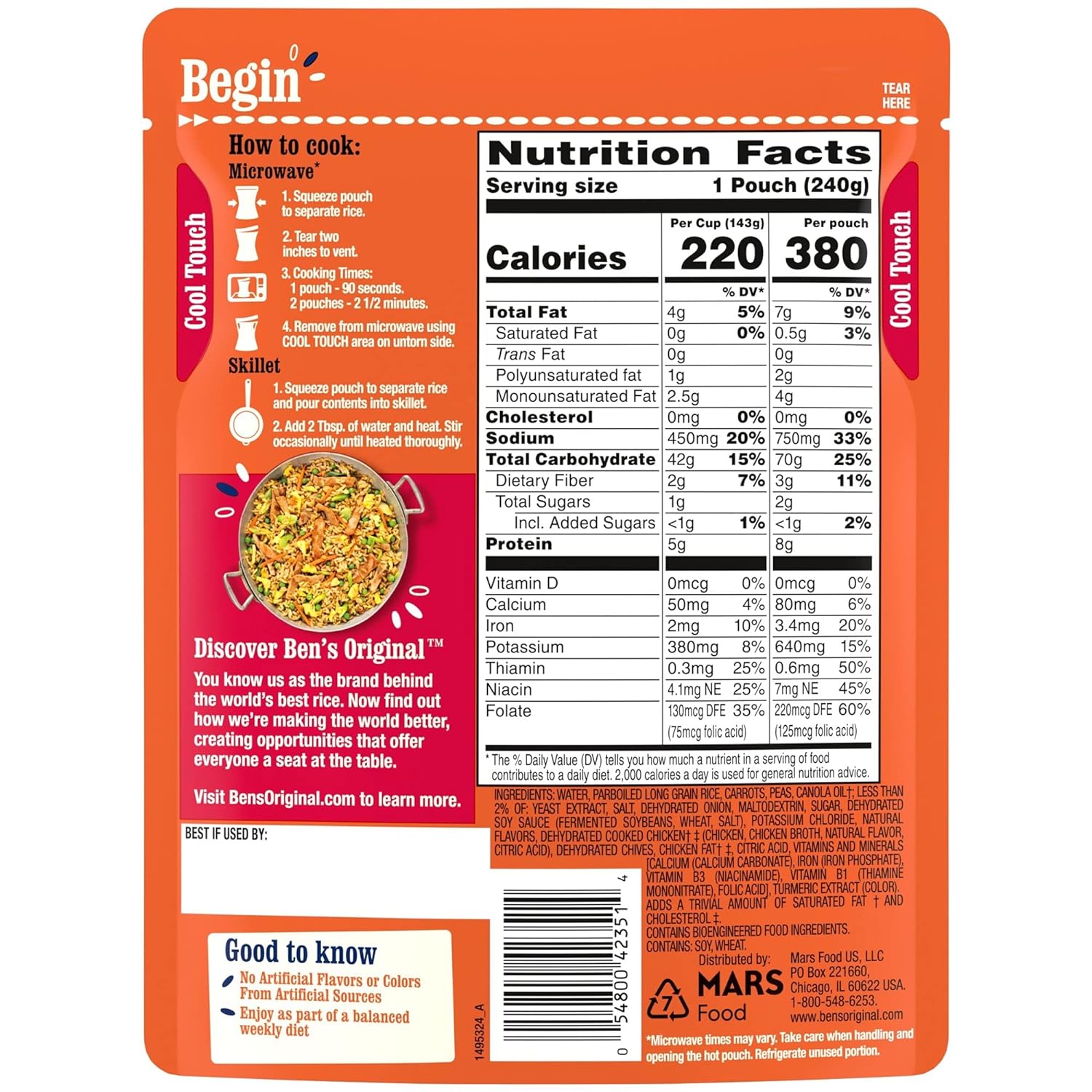 Twelve 8.5 oz pouches of BEN'S ORIGINAL Ready Rice Fried Flavored Rice10This microwave rice helps you enjoy savory stir fry long grain rice and savory veggies in just 90 seconds10Perfect as a rice side dish or as part of a main course, this parboiled rice pouch includes delicious long grain rice, carrots and peas10Toss some egg into the rice mix for an authentic cooked rice dish, or add a handful of veggies for a personal touch10Microwave the rice pouch for 90 seconds, or pour the contents into a skillet and heat thoroughly before serving10BEN'S ORIGINAL Ready Rice Fried Rice helps you treat your family to a side of tender stir fry long grain rice and savory veggies in just 90 seconds. This microwave rice pouch offers parboiled long grain rice with carrots and peas for delicious flavored rice that will enhance any meal. BEN'S ORIGINAL Ready Rice comes in a BPA-free microwavable pouch, eliminating prep and cleanup to make your time in the kitchen easier. Microwave the rice pouch for 90 seconds or pour the contents into a skillet and heat thoroughly before serving to enjoy as a satisfying rice side dish or as part of a savory main course. Add a handful of veggies to this parboiled rice for a personal touch, or toss some egg into the mix for an authentic cooked rice dish. This fried rice contains no artificial flavors, no colors from artificial sources and no trans fat. BEN'S ORIGINAL is dedicated to creating meals and experiences that offer everyone a seat at the table