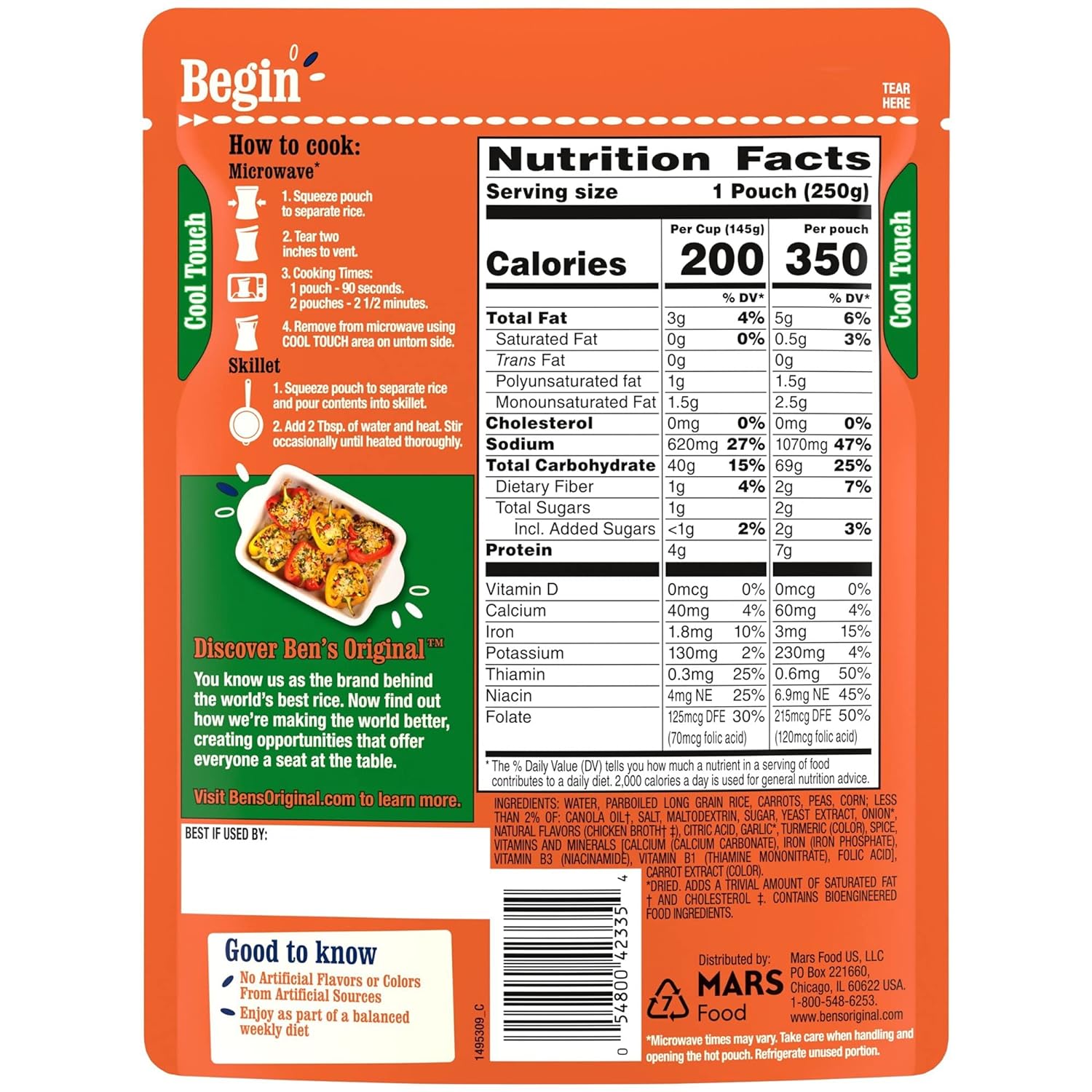 Twelve 8.8 oz pouches of BEN'S ORIGINAL Ready Rice Garden Vegetable Flavored Rice10Microwave rice that helps you enjoy hassle-free dining with a taste of deliciously seasoned cooked rice and savory veggies in just 90 seconds10Each parboiled rice pouch offers long grain rice with peas, carrots and corn to make your meals more flavorful10Pair this cooked rice side dish with your favorite meats or serve it plain for a quick bite10Place the pouch in the microwave and cook it for 90 seconds, or pour the contents into a skillet and heat thoroughly10BEN'S ORIGINAL Ready Rice Garden Vegetable Rice helps you enjoy hassle-free dining with a taste of deliciously seasoned cooked rice and savory veggies in just 90 seconds. This microwave rice side dish offers parboiled long grain rice with peas, carrots and corn to make your meals more flavorful. BEN'S ORIGINAL Ready Rice comes in a BPA-free microwavable rice pouch that makes cooking easier by eliminating prep or cleanup. To get this flavored rice ready to serve, all you have to do is place the pouch in the microwave and cook it for 90 seconds, or pour the contents into a skillet and heat thoroughly. Pair this parboiled rice with your favorite meats or serve it plain for a quick bite. This garden vegetable rice contains no artificial flavors, no colors from artificial sources, no trans fat, and is low in saturated fat. BEN'S ORIGINAL is dedicated to creating meals and experiences that offer everyone a seat at the table