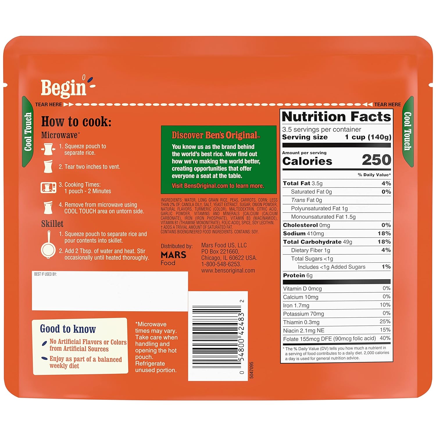 Six 17.3 oz pouches of BEN'S ORIGINAL READY RICE Garden Vegetable Medley Flavored Rice, Family Size10Microwave rice that helps you enjoy hassle-free dining with a taste of deliciously seasoned cooked rice and savory veggies10Each parboiled rice pouch offers long grain rice with peas, carrots and corn to make your meals more flavorful10Pair this cooked rice side dish with your favorite meats or serve it plain for a quick bite10Place the pouch in the microwave and cook it for 2 minutes, or pour the contents into a skillet and heat thoroughly10BEN'S ORIGINAL READY RICE Garden Vegetable Medley Flavored Rice, Family Size helps you enjoy hassle-free dining with a taste of deliciously seasoned cooked rice and savory veggies in minutes. This family-sized side dish offers parboiled long grain rice with peas, carrots and corn to make your meals more flavorful. BEN'S ORIGINAL READY RICE comes in a BPA-free microwavable rice pouch that makes cooking easier by minimizing any prep and cleanup. To get this flavored rice ready to serve, all you have to do is place the pouch in the microwave and cook it for 2 minutes, or pour the contents into a skillet and heat thoroughly. Pair this parboiled rice with your favorite meats or serve it plain for a quick bite. This garden vegetable pouch contains no artificial flavors, no colors from artificial sources, no trans fat, and is low in saturated fat. BEN'S ORIGINAL is dedicated to creating meals and experiences that offer everyone a seat at the table