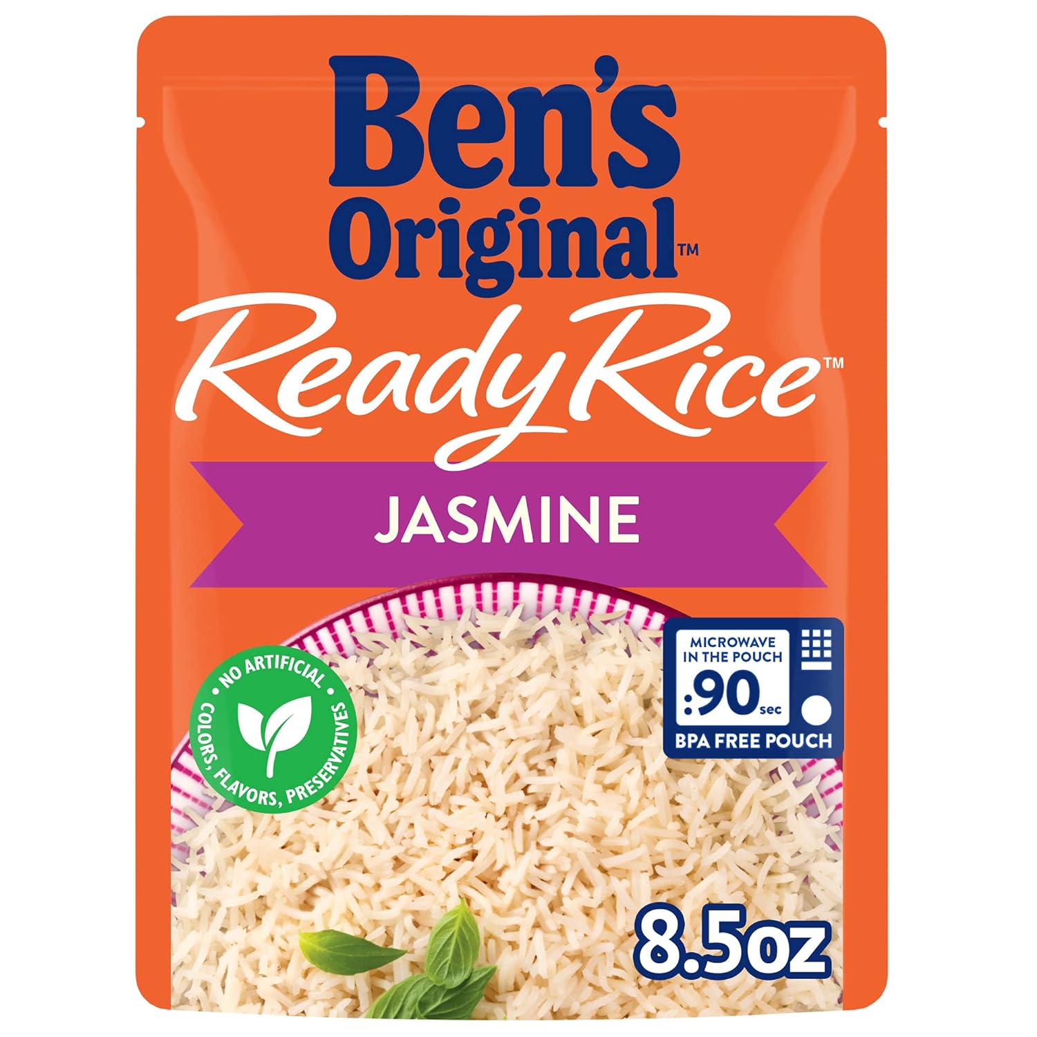 Six 8.5 oz pouches of BEN'S ORIGINAL Ready Rice Jasmine Rice10Microwave rice pouch that provides a delicious substitute for white rice, brown rice, or wild rice in just 90 seconds10Contains 100% authentic Thai rice that tastes great as a cooked rice side dish or as part of a savory main course10Pair this long grain rice with your favorite Southeast Asian cuisine entrees or serve it plain10Microwave this rice for 90 seconds or thoroughly heat it in a skillet before serving10BEN'S ORIGINAL Ready Rice Jasmine Rice provides a delicious substitute for white rice, brown rice, or wild rice in just 90 seconds. Great as a cooked rice side dish or part of a savory main course, this microwave rice offers 100% authentic Thai rice that is perfect for satisfying your desire for Southeast Asian food. This long grain rice comes in a BPA-free microwaveable rice pouch that eliminates prep and cleanup, making it easier than ever to create a globally-inspired meal. For effortless cooking, microwave this rice for 90 seconds or thoroughly heat it in a skillet before serving. Pair this rice with your favorite Southeast Asian cuisine entrees or serve it plain. This Jasmine rice is vegetarian, very low in sodium and fat, and contains no artificial flavors, no artificial colors, no preservatives, or cholesterol. BEN'S ORIGINAL is dedicated to creating meals and experiences that offer everyone a seat at the table