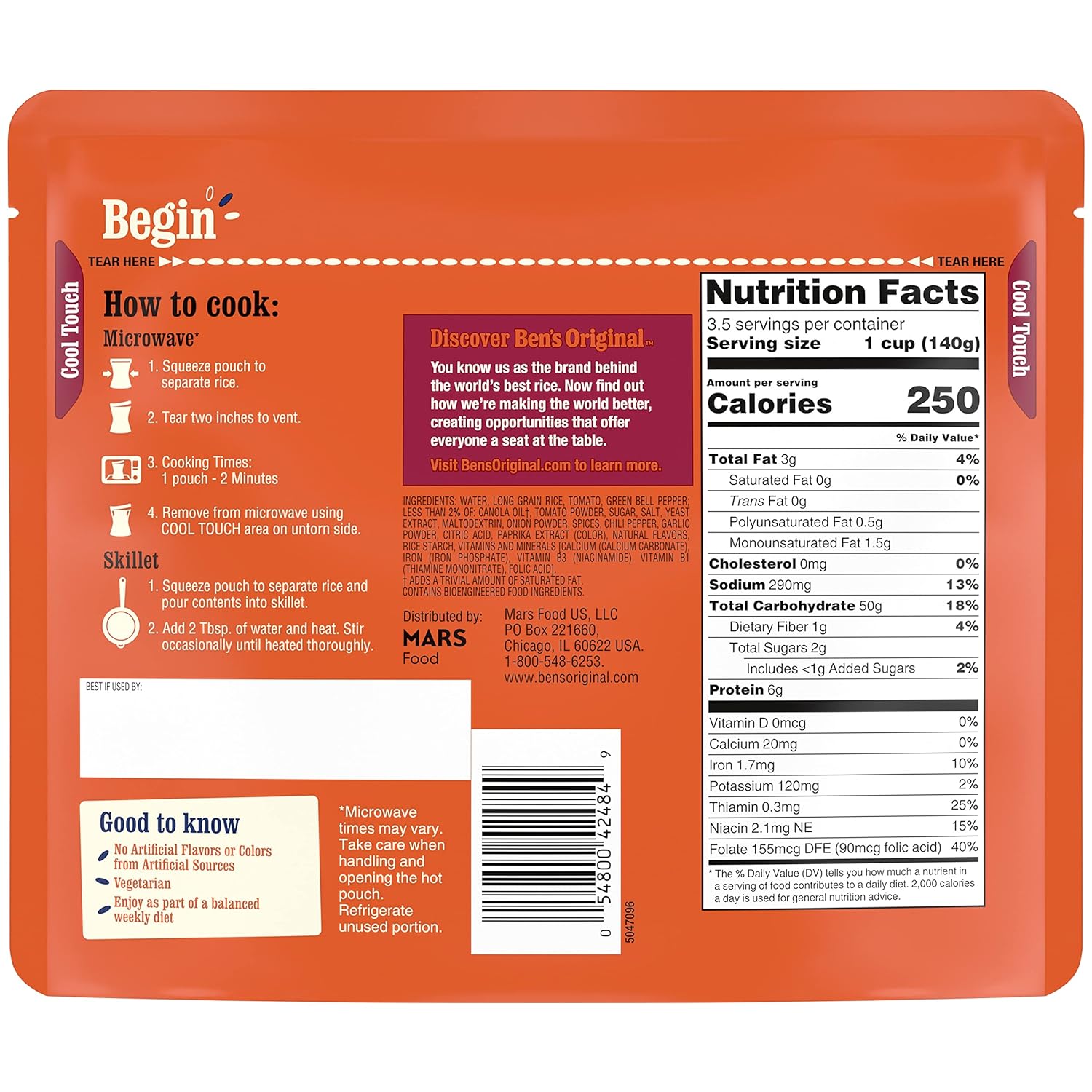 Six 17.3 oz pouches of BEN'S ORIGINAL READY RICE Spanish Style Flavored Rice, Family Size10Deliciously seasoned, Spanish-inspired parboiled rice that is ready to eat in minutes10This microwave rice pouch offers long grain rice with tomatoes, peppers, herbs, and spices for a cooked rice side dish you and your guests will love10Pair this seasoned rice with chicken, Latin dishes, or serve it plain for a quick bite10Cook this Spanish rice family pack in the microwave for 2 minutes, or thoroughly heat it in a skillet before serving10BEN'S ORIGINAL READY RICE Spanish Style Flavored Rice, Family Size is a convenient microwave rice option that makes it easy to taste deliciously seasoned, Spanish-inspired parboiled rice in minutes. This family-sized Spanish rice pouch offers pre-cooked long grain rice with the savory flavors of tomatoes, peppers, herbs, and spices for a cooked rice side dish you and your guests will love. Available in an easy-to-handle, BPA-free microwaveable rice pouch, READY RICE minimizes prep and cleanup to help you spend less time in the kitchen. Bring a flavorful addition to your meals by cooking this Spanish rice in the microwave for 2 minutes, or thoroughly heating it in a skillet before serving. Pair this seasoned rice with chicken, Latin dishes, or serve it plain for a quick bite. This parboiled rice contains no artificial flavors, no colors from artificial sources, no trans fat, and no cholesterol. BEN'S ORIGINAL is dedicated to creating meals and experiences that offer everyone a seat at the table