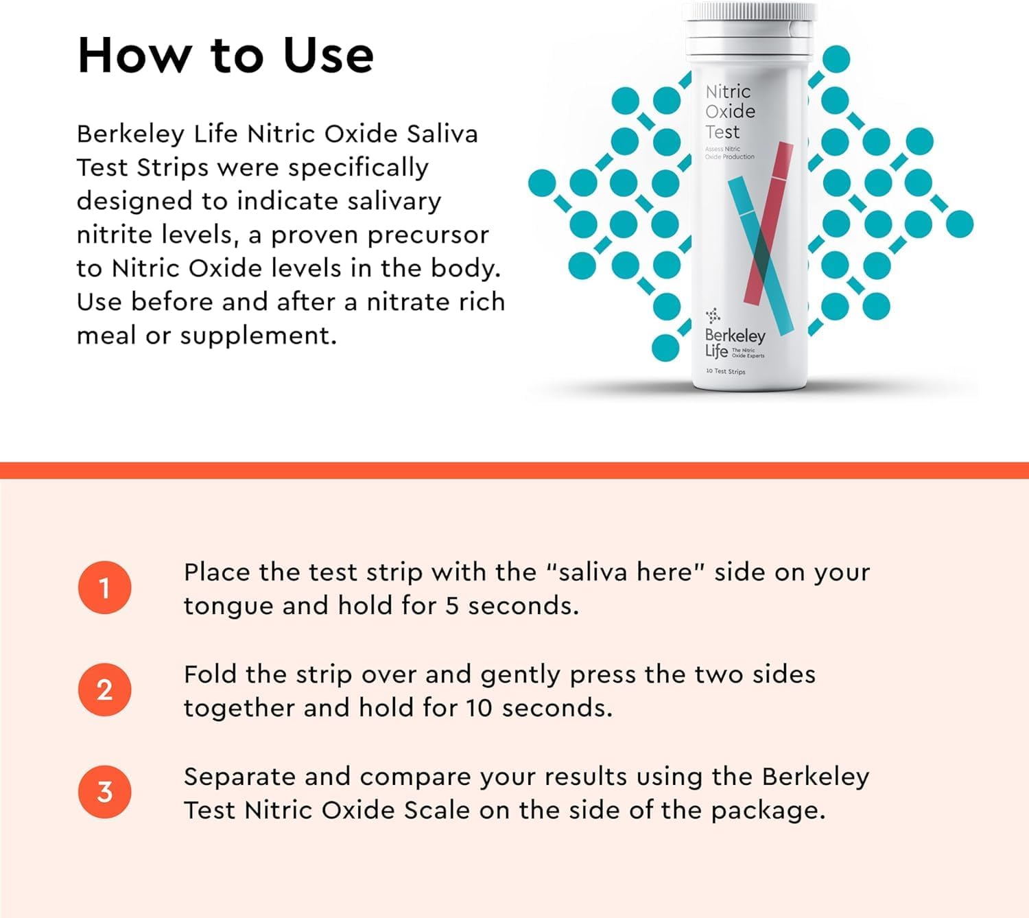 Results in Seconds: Be in the N.O. in as little as 15 seconds! This kit comes with 50 easy-to-use nitric oxide test strips for convenient, daily nitric oxide tracking, especially following nitrate-rich meals and supplementation