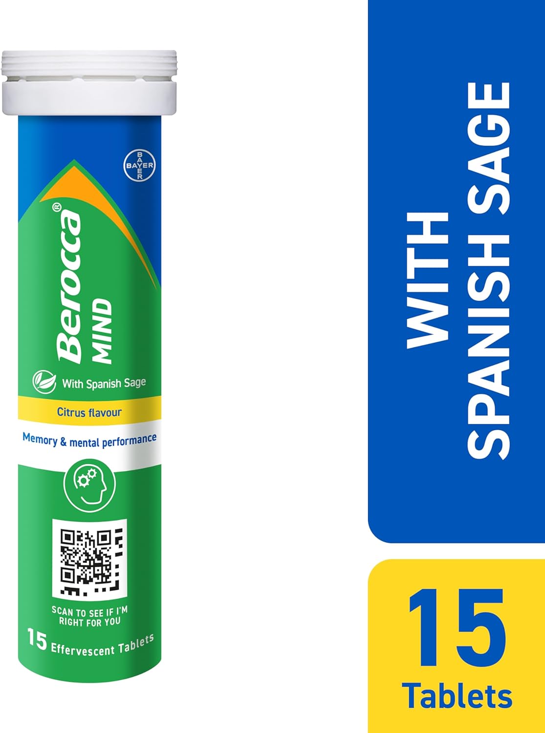 Berocca Mind Effervescent Tablets Including B Vitamins, With Spanish Sage To Support Memory And Mental Performance - 15 Tablets - Citrus Flavour