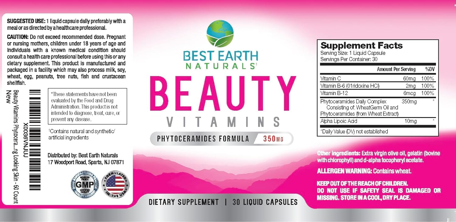 About this item Beauty Vitamins by Best Earth Naturals is specially formulated to help promote healthy, hydrated, young looking skin! Beauty Vitamins contains Phytoceramides to Help Hydrate Skin Without Creams & Lotions. Skin Deep! Beauty Vitamins Contains Phytoceramides, Alpha Lipoic Acid, Vitamins C, B-6 and B-12 and more to help Reduce Appearance Of Fine Lines & Wrinkles and to help skin hydration Beauty Vitamins with Phytoceramides Smooth Skin Support Formula: Our Phytoceramides 350 mg Supplement is intended to help the appearance of fine lines and wrinkles. Helps support smooth skin. Our Phytoceramides 350 mg plant derived is fortified with Vitamins A, C, D, and E for powerful results designed to work. Take Best Earth Naturals Beauty Vitamins with Phytoceramides to help support for: Hair, Skin Hydration, Collagen, Strong Nails, and more! We stand by our products. We never compromise on quality or service, to ensure excellence in providing you with a superior product. Best Earth Naturals stands by all of its supplements and vitamins, so you can try all of Best Earth Naturals vitamins and supplements with confidence! We never compromise on quality or service and stand behind every Best Earth Naturals product. › See more product details,Beauty Vitamins by Best Earth Naturals is specially formulated to help promote healthy, hydrated, young looking skin! Beauty Vitamins contains Phytoceramides to Help Hydrate Skin Without Creams & Lotions,Skin Deep! Beauty Vitamins Contains Phytoceramides, Alpha Lipoic Acid, Vitamins C, B-6 and B-12 and more to help Reduce Appearance Of Fine Lines & Wrinkles and to help skin hydration,Beauty Vitamins with Phytoceramides Smooth Skin Support Formula: Our Phytoceramides 350 mg Supplement is intended to help the appearance of fine lines and wrinkles. Helps support smooth skin. Our Phytoceramides 350 mg plant derived is fortified with Vitamins A, C, D, and E for powerful results designed to work,Take Best Earth Naturals Beauty Vitamins with Phytoceramides to help support for: Hair, Skin Hydration, Collagen, Strong Nails, and more!,We stand by our products. We never compromise on quality or service, to ensure excellence in providing you with a superior product. Best Earth Naturals stands by all of its supplements and vitamins, so you can try all of Best Earth Naturals vitamins and supplements with confidence! We never compromise on quality or service and stand behind every Best Earth Naturals product