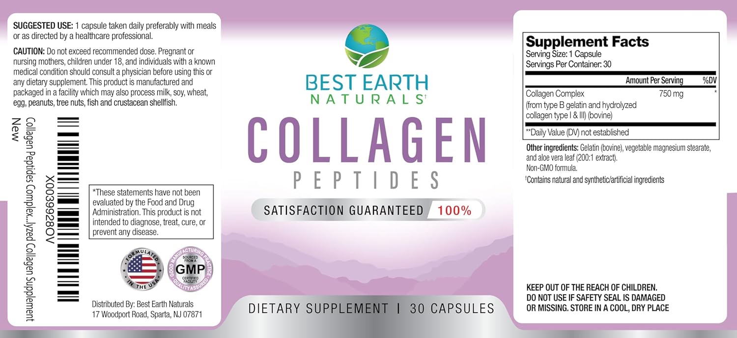 About this item For Brighter Skin: Our supplement has Collagen Type I & III that may support skin glow, which may help keep skin firm, elastic, and hydrated. Promote Strong Hair, Nails, and Tissues: Enriched with collagen elements, our supplement supports the health and strength of hair, nails, and body tissues. Promote Joint Health: Our collagen supplement helps maintain comfort, flexibility, and mobility. Convenient Capsule Supply: Each bottle contains 30 capsules, offering a simple one-month supply. Quality Components: Best Earth Naturals provides vitamins and supplements, ensuring your body receives essential nutrients to support optimal functioning. › See more product details,For Brighter Skin: Our supplement has Collagen Type I & III that may support skin glow, which may help keep skin firm, elastic, and hydrated,Promote Strong Hair, Nails, and Tissues: Enriched with collagen elements, our supplement supports the health and strength of hair, nails, and body tissues,Promote Joint Health: Our collagen supplement helps maintain comfort, flexibility, and mobility,Convenient Capsule Supply: Each bottle contains 30 capsules, offering a simple one-month supply,Quality Components: Best Earth Naturals provides vitamins and supplements, ensuring your body receives essential nutrients to support optimal functioning