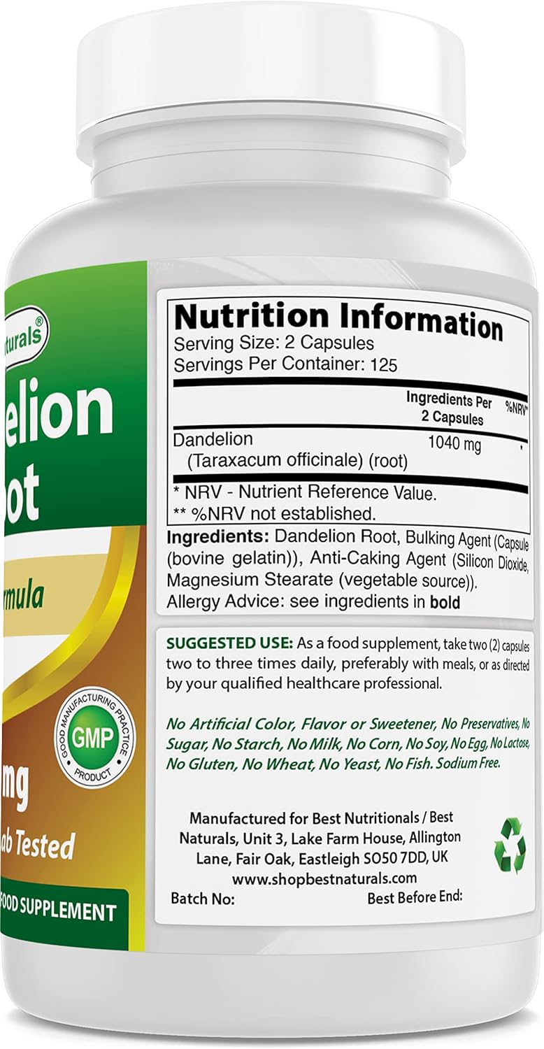 Dandelion (Taraxacum officinal) is a common flowering plant found abundantly in all temperate zones of the Northern Hemisphere. Considered by some to be a nuisance weed with no redeeming properties, Dandelion Root is a source of many naturally occurring compounds including carotenoids, fatty acids, flavonoids and phytosterols,3rd Party Lab Tested for Purity & Quality,520 mg of Dandelion Root per Capsule - 250 Capsules per Bottle,Non-GMO & Gluten-Free,Proudly Made in USA, GMP Compliant, FDA Registered Facility,No Artificial Color, Flavor, or Sweetener, No Preservatives, No Sugar, No Milk, No Corn, No Soy, No Egg, No Lactose, No Gluten, No Wheat, No Yeast, No Fish. Sodium Free