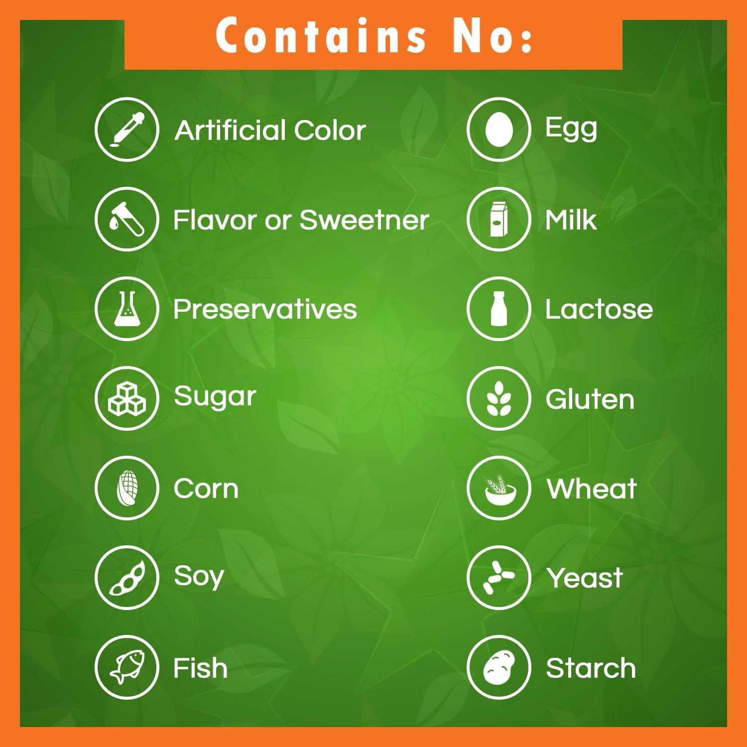 No Artificial Color, Flavor, or Sweetener, No Preservatives, No Sugar, No Milk, No Corn, No Soy, No Egg, No Lactose, No Gluten, No Wheat, No Yeast, No Fish. Sodium Free