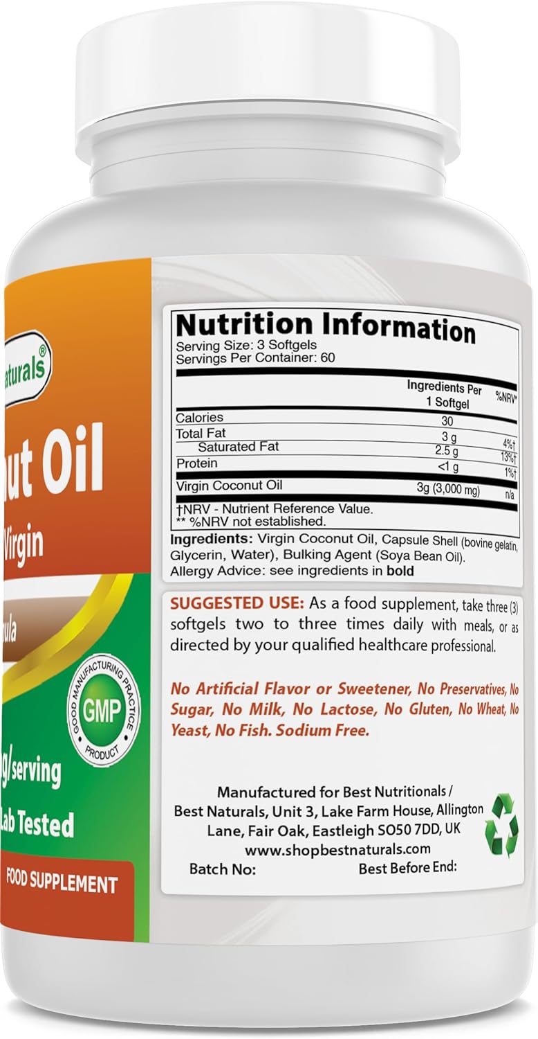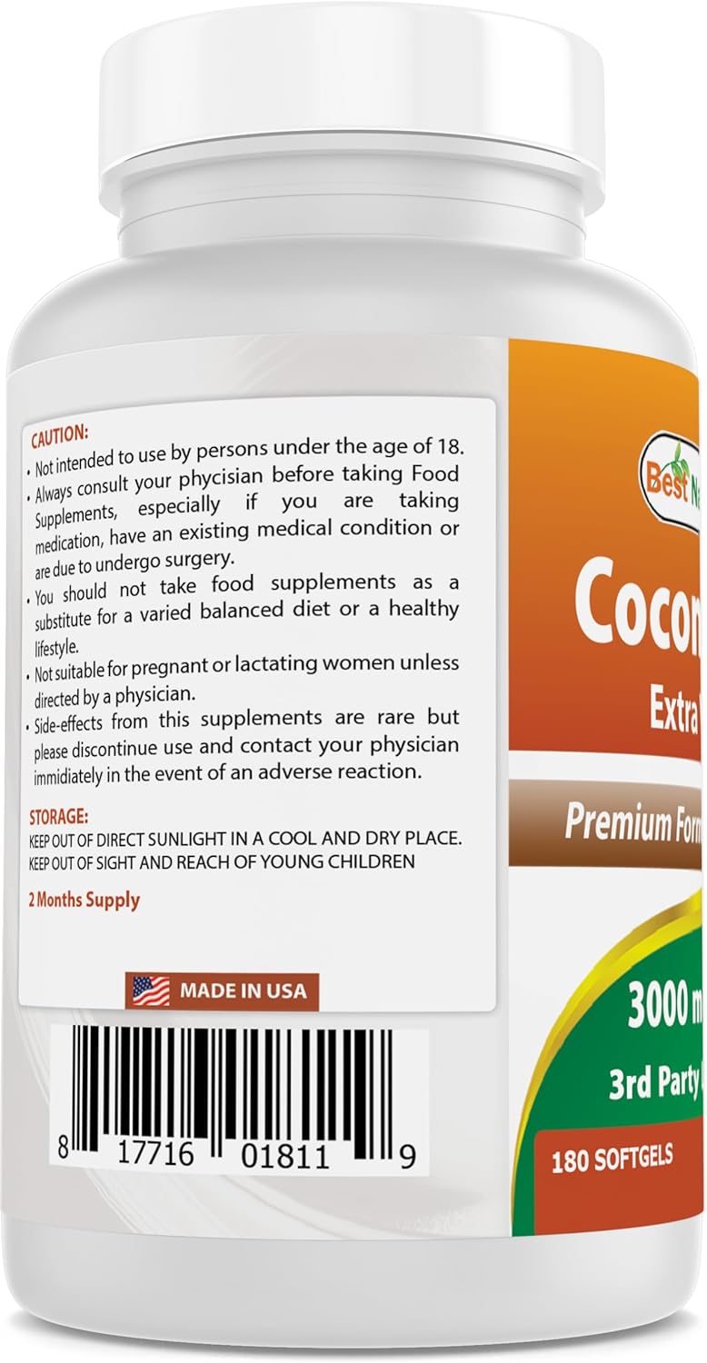 Coconut oil is an edible oil that has been consumed in tropical places for thousands of years. Coconut is the fruit of the coconut palm. The oil of the nut (fruit) is used to make medicine. Coconut oil is high in a saturated fat called medium chain triglycerides. These fats work differently than other types of saturated fat in the body. However, research on the effects of these types of fats in the body is very preliminary,3rd Party Lab Tested for Purity & Quality,1000 mg of Coconut oil per Softgel - 180 Softgels per Bottle,Non-GMO & Gluten-Free,Proudly Made in USA, GMP Compliant, FDA Registered Facility,No Artificial Color, Flavor, or Sweetener, No Preservatives, No Sugar, No Milk, No Corn, No Soy, No Egg, No Lactose, No Gluten, No Wheat, No Yeast, No Fish. Sodium Free