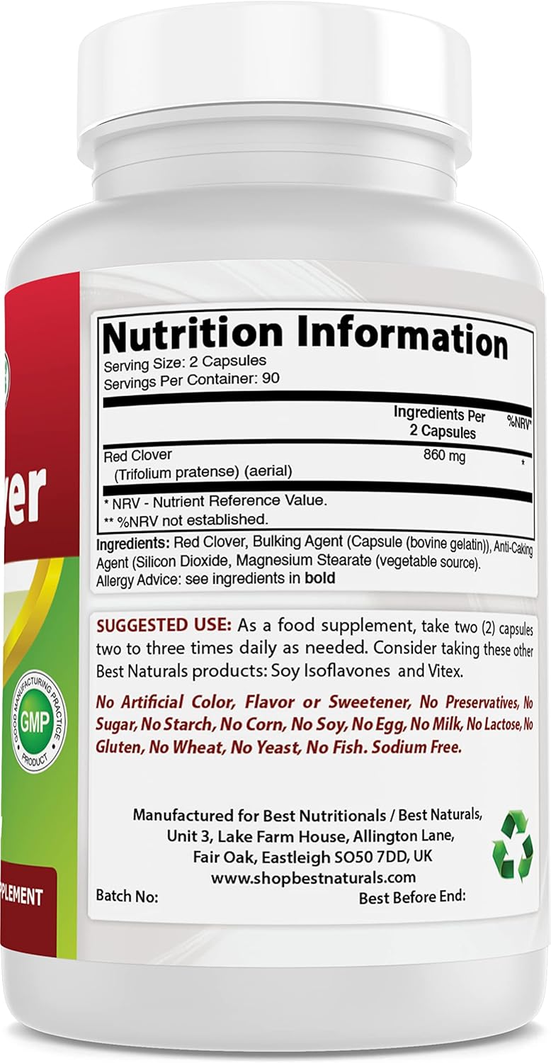 About this item 3rd Party Lab Tested for Purity & Quality. 430 mg of Red Clover per Capsule - 180 Capsules per Bottle. Non-GMO & Gluten-Free. Proudly Made in USA, GMP Compliant, FDA Registered Facility. No Artificial Color, Flavor, or Sweetener, No Preservatives, No Sugar, No Milk, No Corn, No Soy, No Egg, No Lactose, No Gluten, No Wheat, No Yeast, No Fish. Sodium Free. › See more product details,3rd Party Lab Tested for Purity & Quality,430 mg of Red Clover per Capsule - 180 Capsules per Bottle,Non-GMO & Gluten-Free,Proudly Made in USA, GMP Compliant, FDA Registered Facility,No Artificial Color, Flavor, or Sweetener, No Preservatives, No Sugar, No Milk, No Corn, No Soy, No Egg, No Lactose, No Gluten, No Wheat, No Yeast, No Fish. Sodium Free