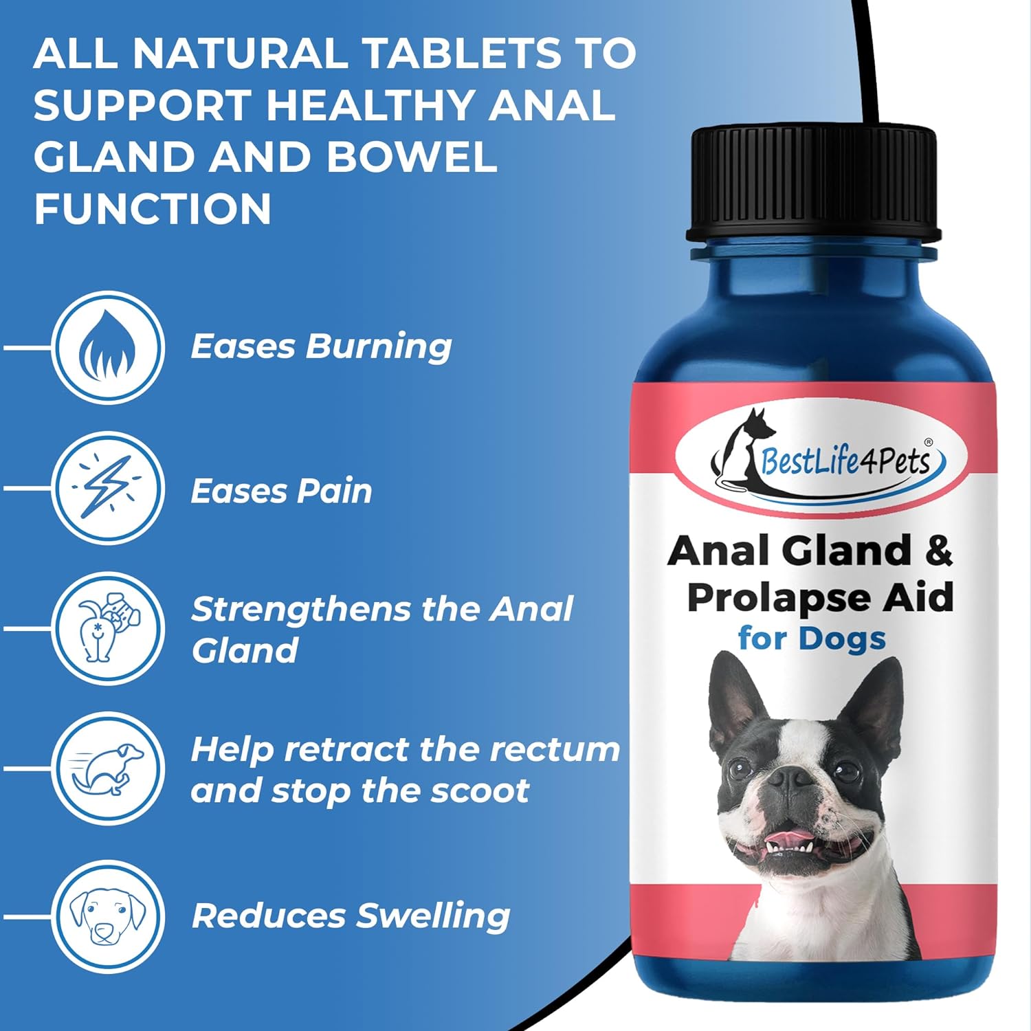 SCOOT STOP FOR DOGS: End the straining and pushing to poop with a natural solution that goes deeper than just a lax fiber or pumpkin chew. The BestLife4Pets Anal Prolapse remedy, eases bum itching and reduces swelling around the anus allowing the dog to poop without painEASES BURNING AND PAIN: Constipation, incomplete bowel movements, and even parasites can cause your dog to have abdominal pain, fecal incontinence - leakage of mucus, stool, and even bleeding from the rectum. Relieve their pain and discomfort with a natural plant based formula that also strengthens the anal gland and restores elasticity to help retract the rectum safely100% NATURAL WITH NO SIDE EFFECTS: Our top quality homeopathic anal gland support treatment has no artificial ingredients or flavors so it won't leave you dealing with painful side-effects like upset stomach, vomiting, or diarrhea. Safe for all canines senior to puppy and even pregnant dogs; our rectal prolapse remedy can be used alongside other dog vitamins or medsEASY, NO FUSS TABLETS: Flavored, smelly chews can be a pain to give your pup; get a dog anal gland support supplement that your pet will actually take without a struggle or fight. These tiny pellets dissolve quickly, have No Odor, and leave No Bad Taste so it is easy to hide them in dog food or treats!