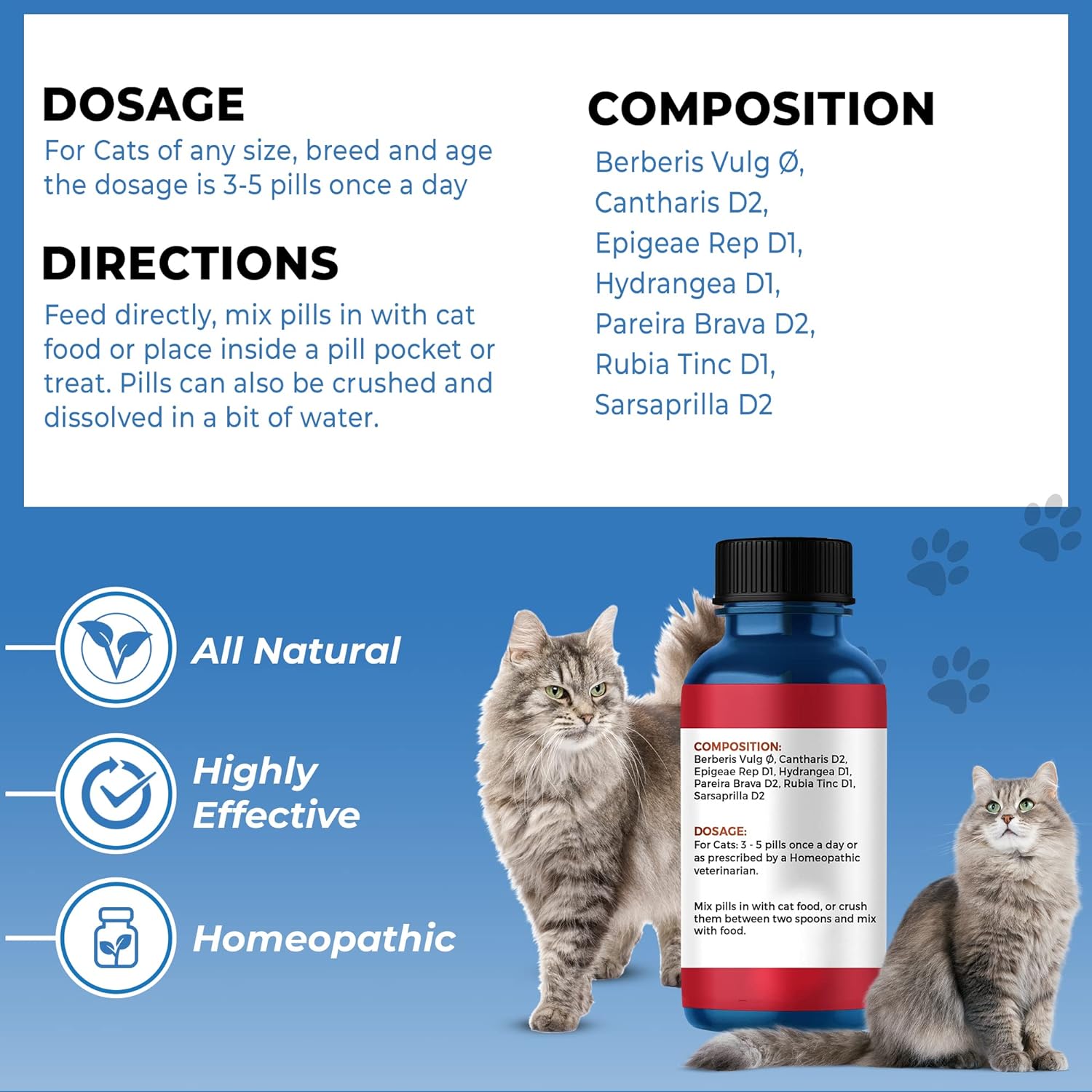 PUT A STOP TO INCONTINENCE AND INVOLUNTARY LEAKAGE: Unlike Milk Thistle treats or Cranberry chews that only treat the symptoms of kidney failure and disease, our superior all natural supplement provides long lasting relief with no side-effects and without harming your catās other healthy organs10STOP FREQUENT URINATION: Especially designed for pets, our renal care homeopathic medicine has been proven to strengthen the renal system and remove deterrents, waste and toxins from your petās body. Keep this critical filtration system healthy to optimize lungs, heart, and liver health10EASY TO GIVE CATS OF ANY AGE OR BREED: These tiny pills have NO ODOR, NO CHEMICALS and leave NO BAD TASTE! This treatment is especially formulated to help flush out kidney stones, strengthen the immune system, prevent kidney failure, and relieve inflammation associated with urinary tract infections10OVERALL UTI SUPPORT: Our ingredients target different areas: Berberis (sharp stitching pains & kidney stones), Cantharis (bladder irritation & urine burning), Epigeae (chronic inflammation & uric acid crystals), Hydrangea (bladder, urethra & prostate), Pareira Brava (frequent urination), Rubia Tinc (supporting organs) & Sarsparilla (kidney disease)10WE BELIEVE PETS DESERVE THE BEST: Just as we strive to put natural āGOOD FOR YOUā ingredients in our bodies to stay healthy, BestLife4Pets believe that we should be giving the same to our beloved feline friends. If you are ever not happy, we will make it right with our 100% HAPPINESS PROMISE